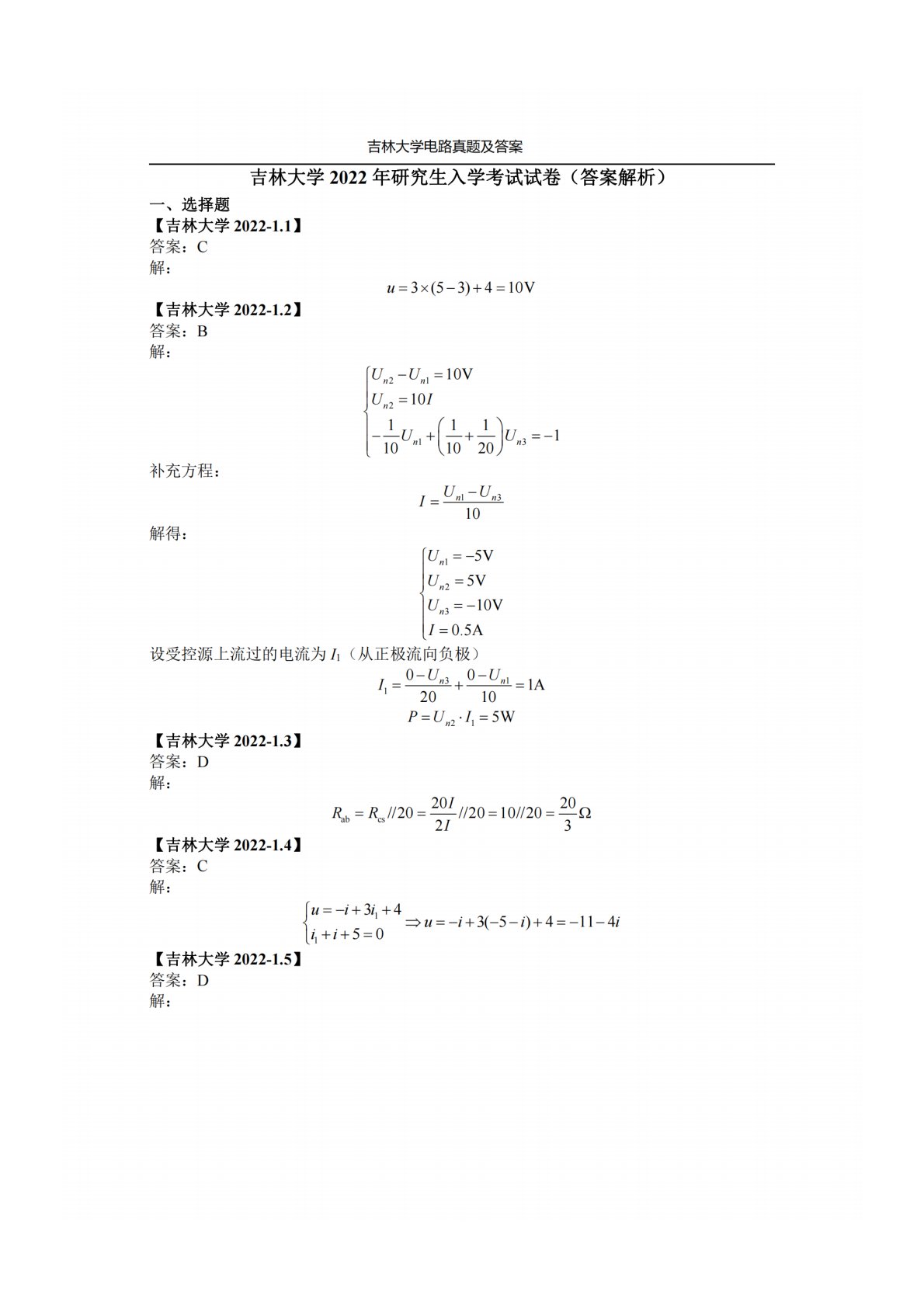 吉林大学848电路原理2022年真题答案