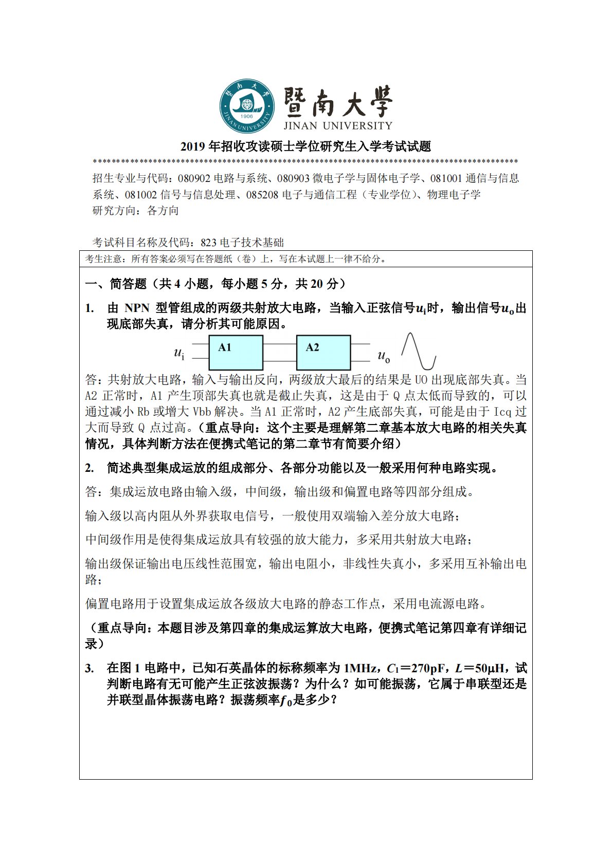 暨南大学823电子技术基础2019年真题答案
