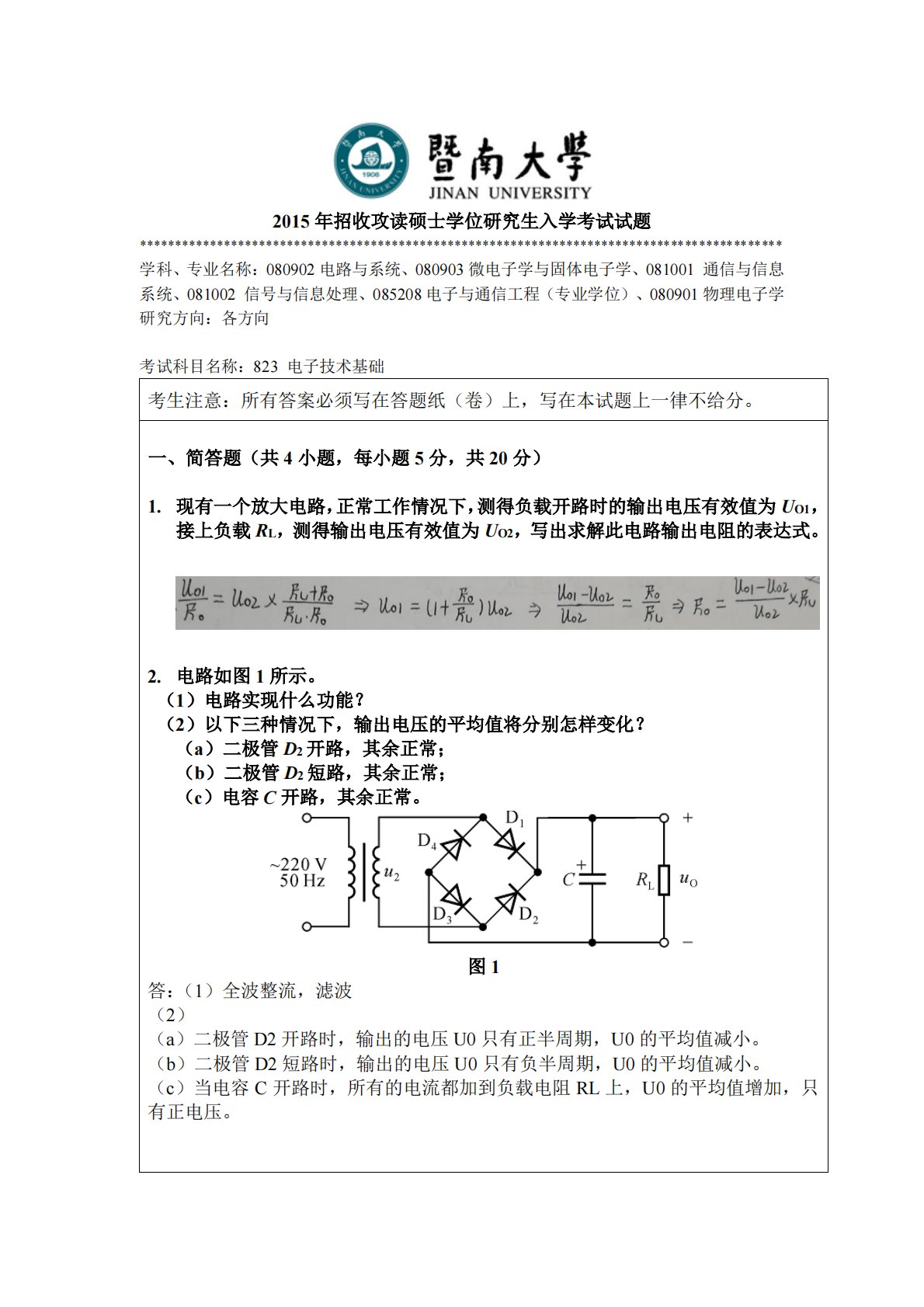 暨南大学823电子技术基础2015年真题答案