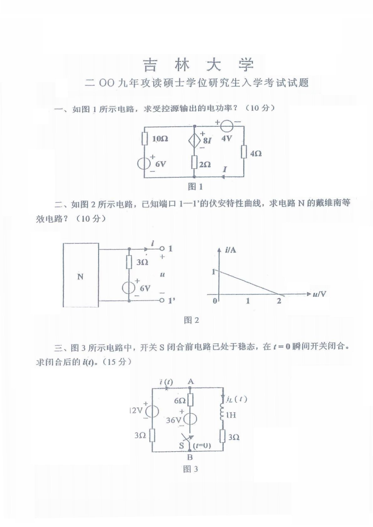 清华大学827电路原理2009年真题