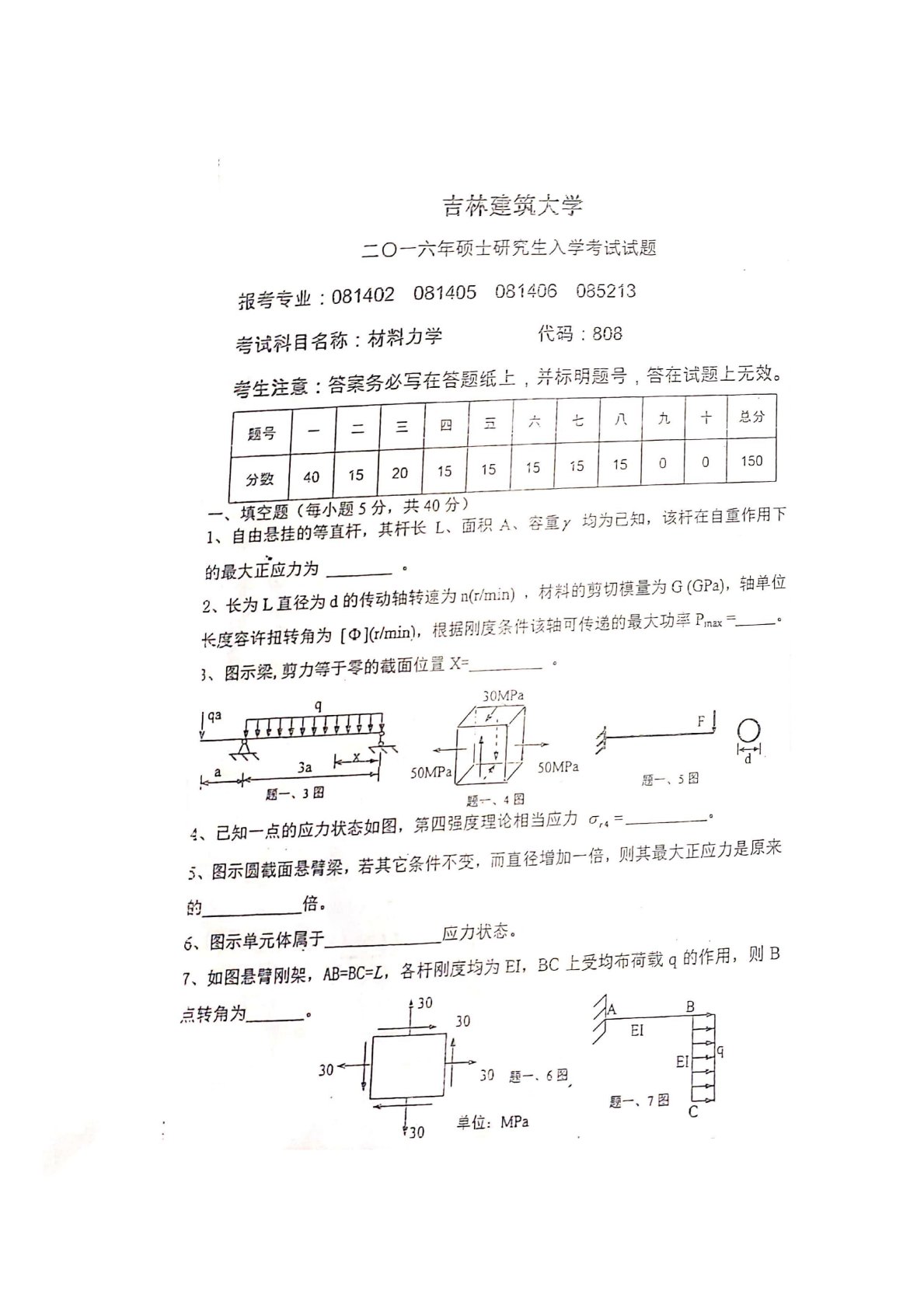 吉林建筑大学808材料力学2016年真题