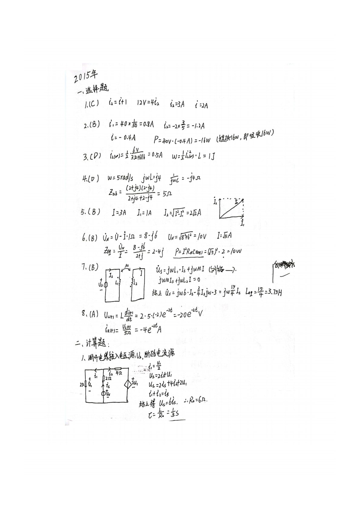吉林大学848电路原理2015年真题答案手写版