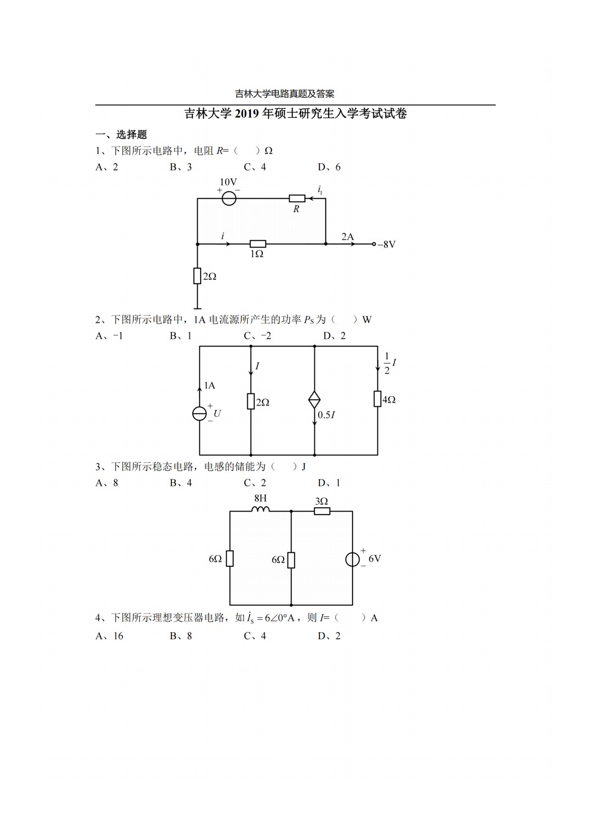吉林大学848电路原理2019年真题