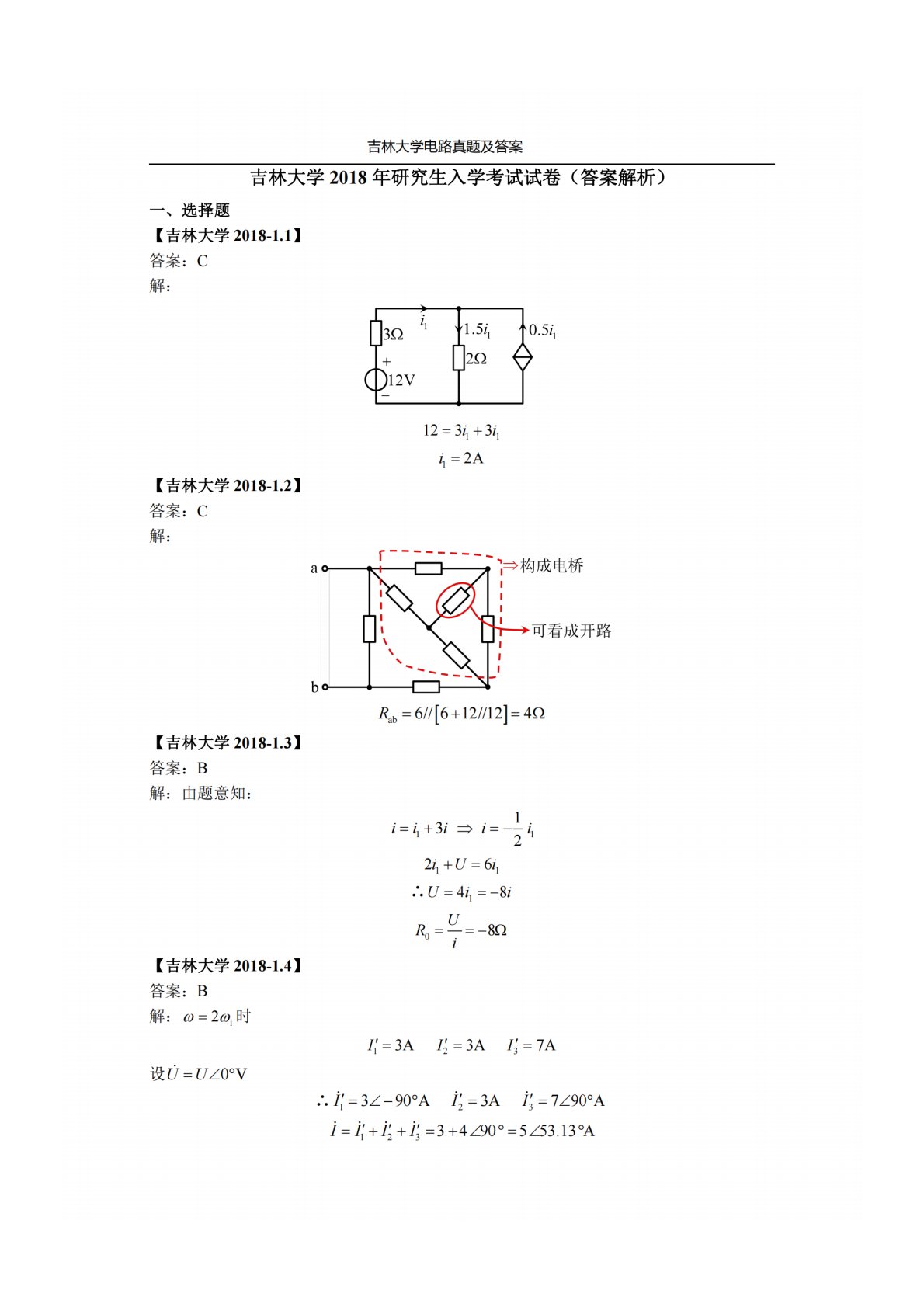 吉林大学848电路原理2018年真题答案