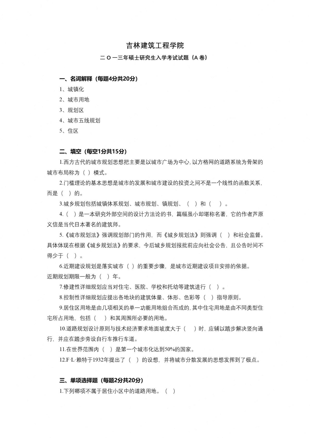吉林建筑大学612城市规划原理2013年A卷真题