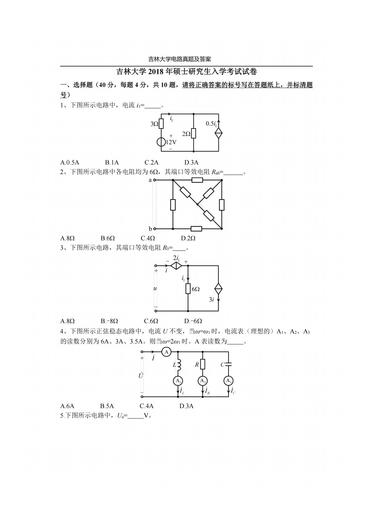 吉林大学848电路原理2018年真题