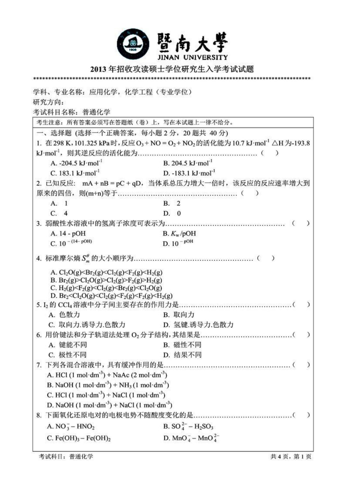 暨南大学普通化学2013年考研真题