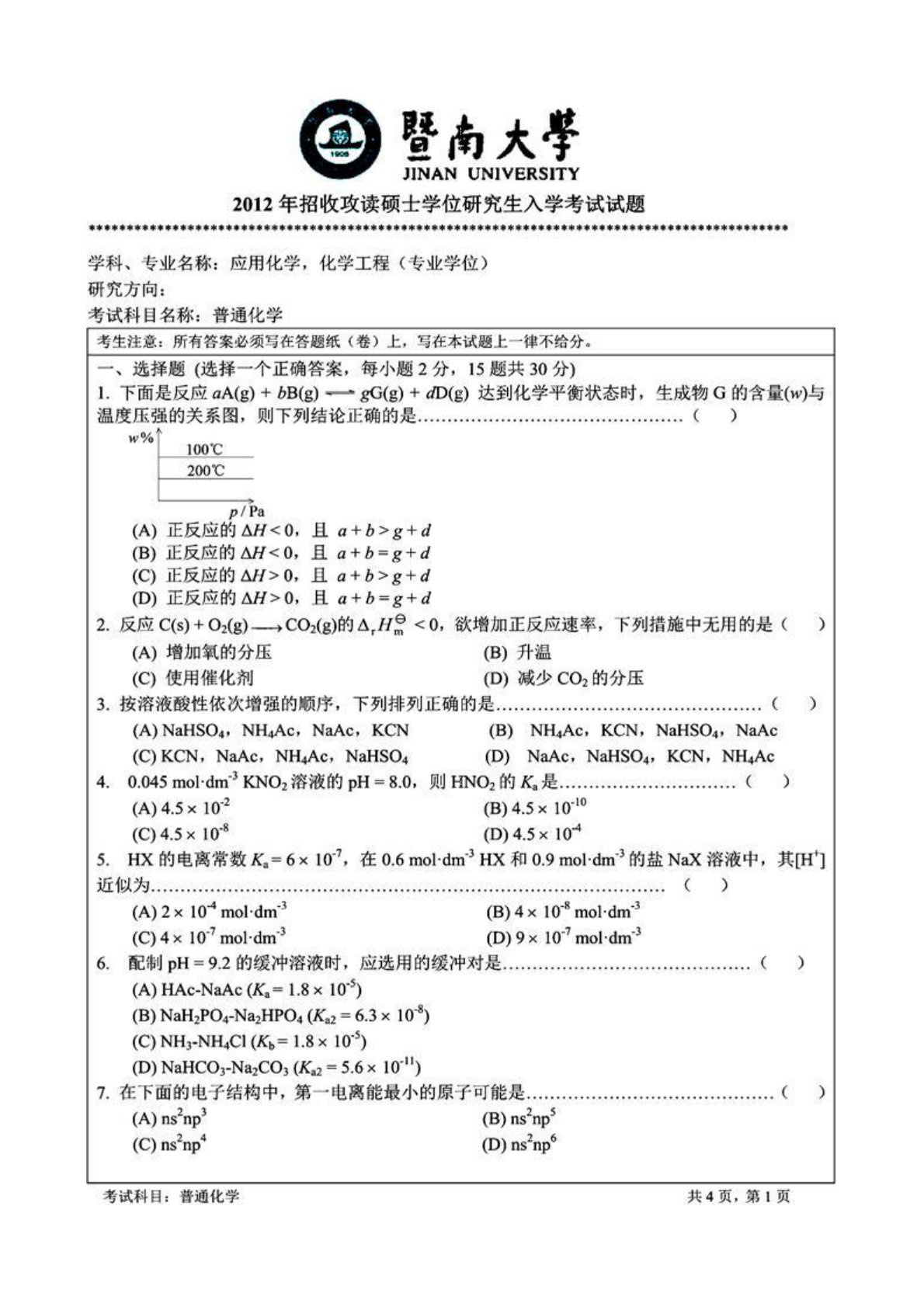 暨南大学普通化学2012年考研真题