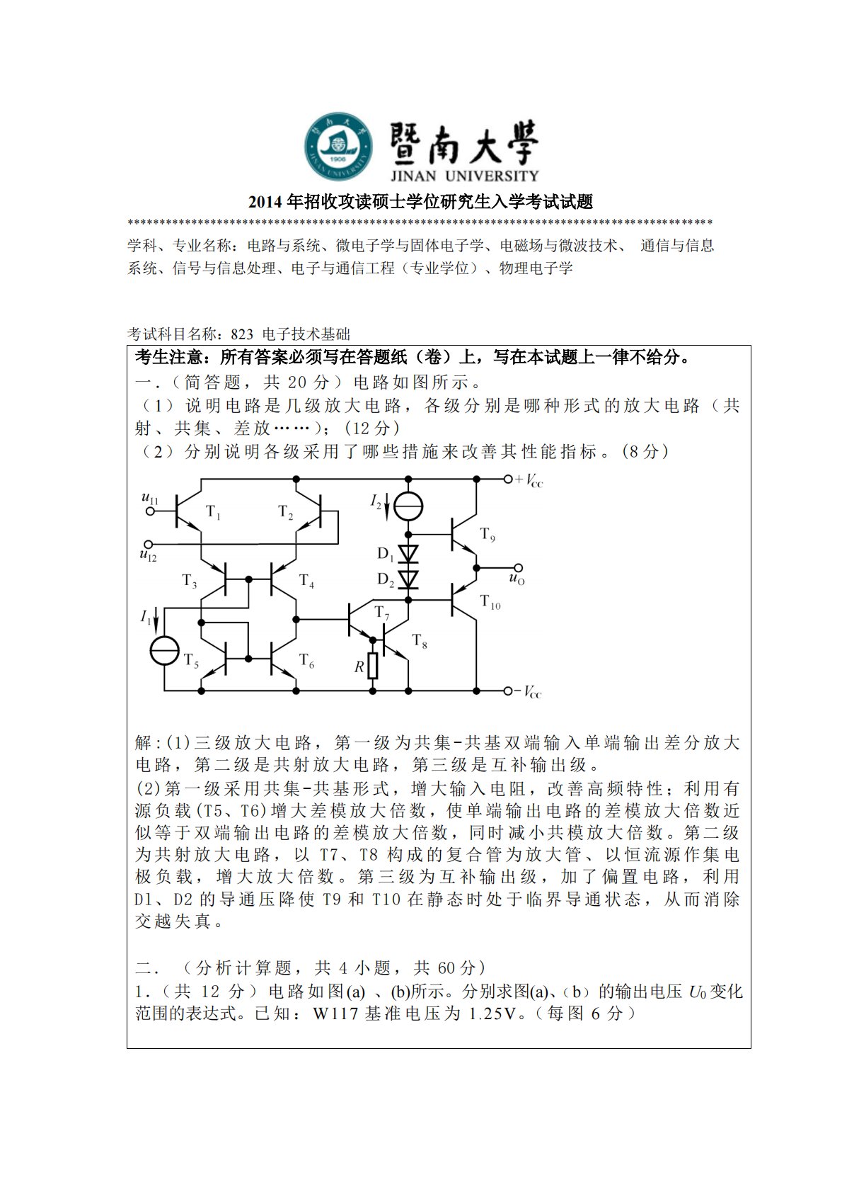 2014年招收攻读硕士学位研究生入学考试试题********************************************************************************************学科、专业名称:电路与系统、微电子学与固体电子学、电磁场与微波技术、通信与信息系统、信号与信息处理、电子与通信工程(专业学位)、物理电子学考试科目名称:823电子技术基础考生注意:所有答案必须写在答题纸(卷)上,写在本试题上一律不给分。一.(简答题,共20分)电路如图所示。(1)说明电路是几级放大电路,各级分别是哪种形式的放大电路(共射、共集、差放……);(12分)(2...