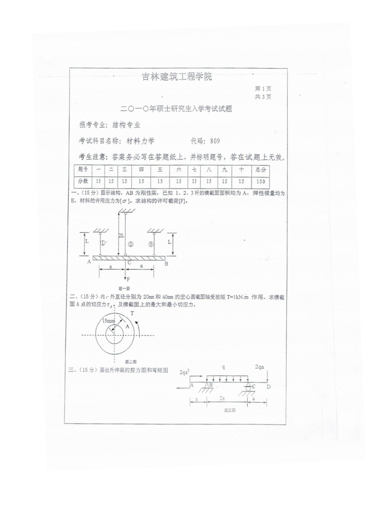 吉林建筑大学808材料力学2010年真题