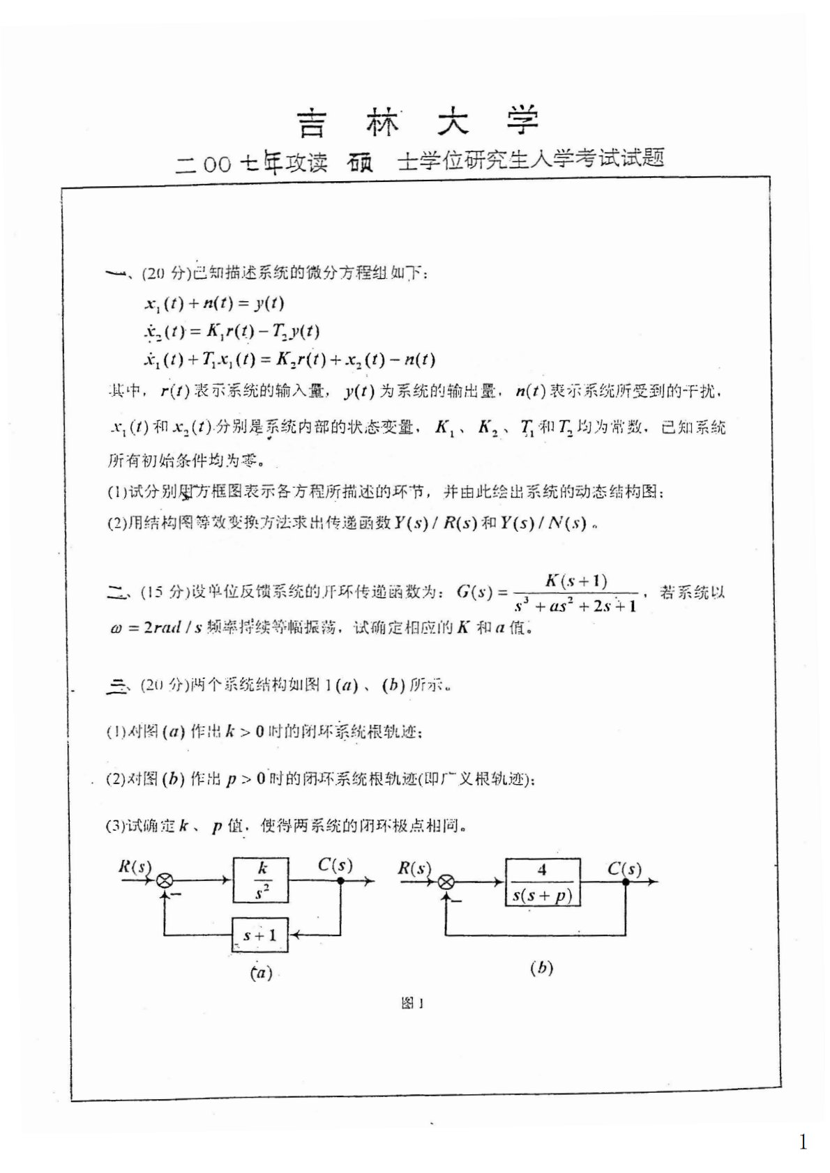 吉林大学901自动控制原理2007年真题
