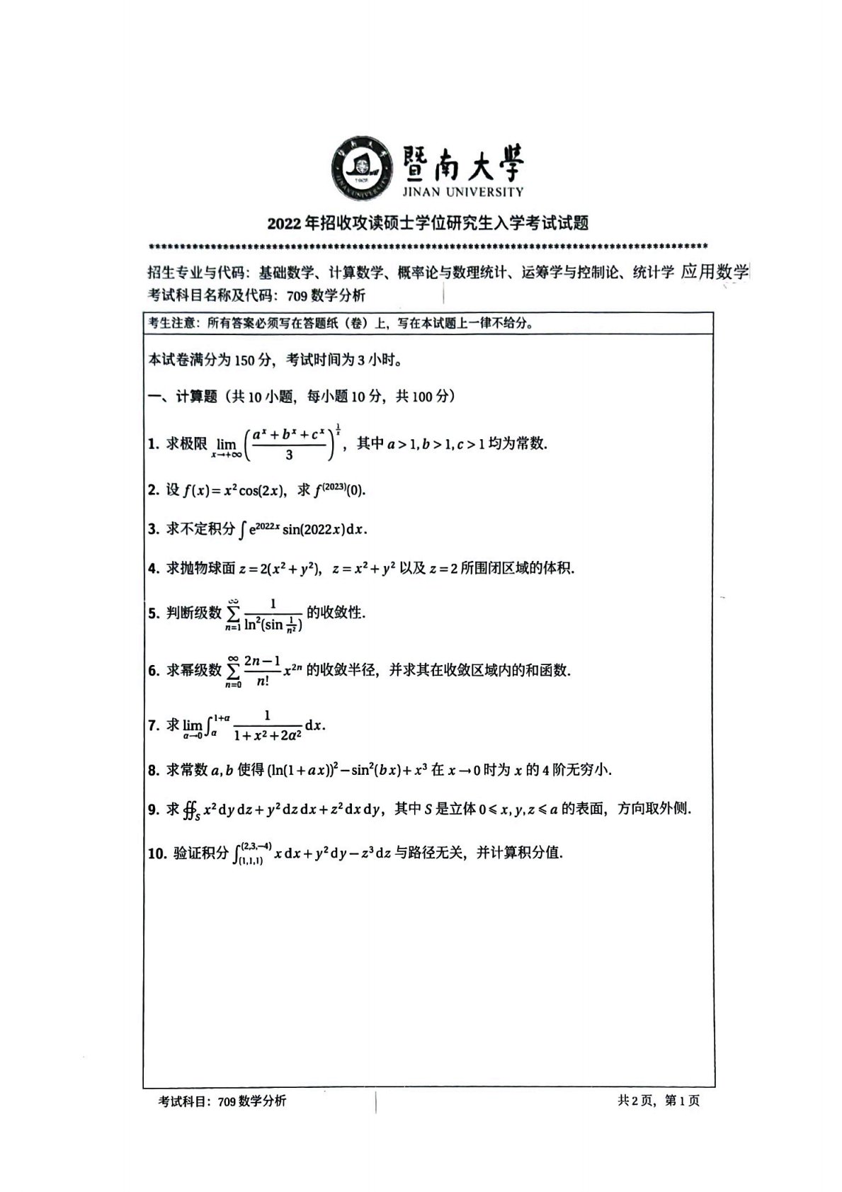 暨南大学709 数学分析2022年真题