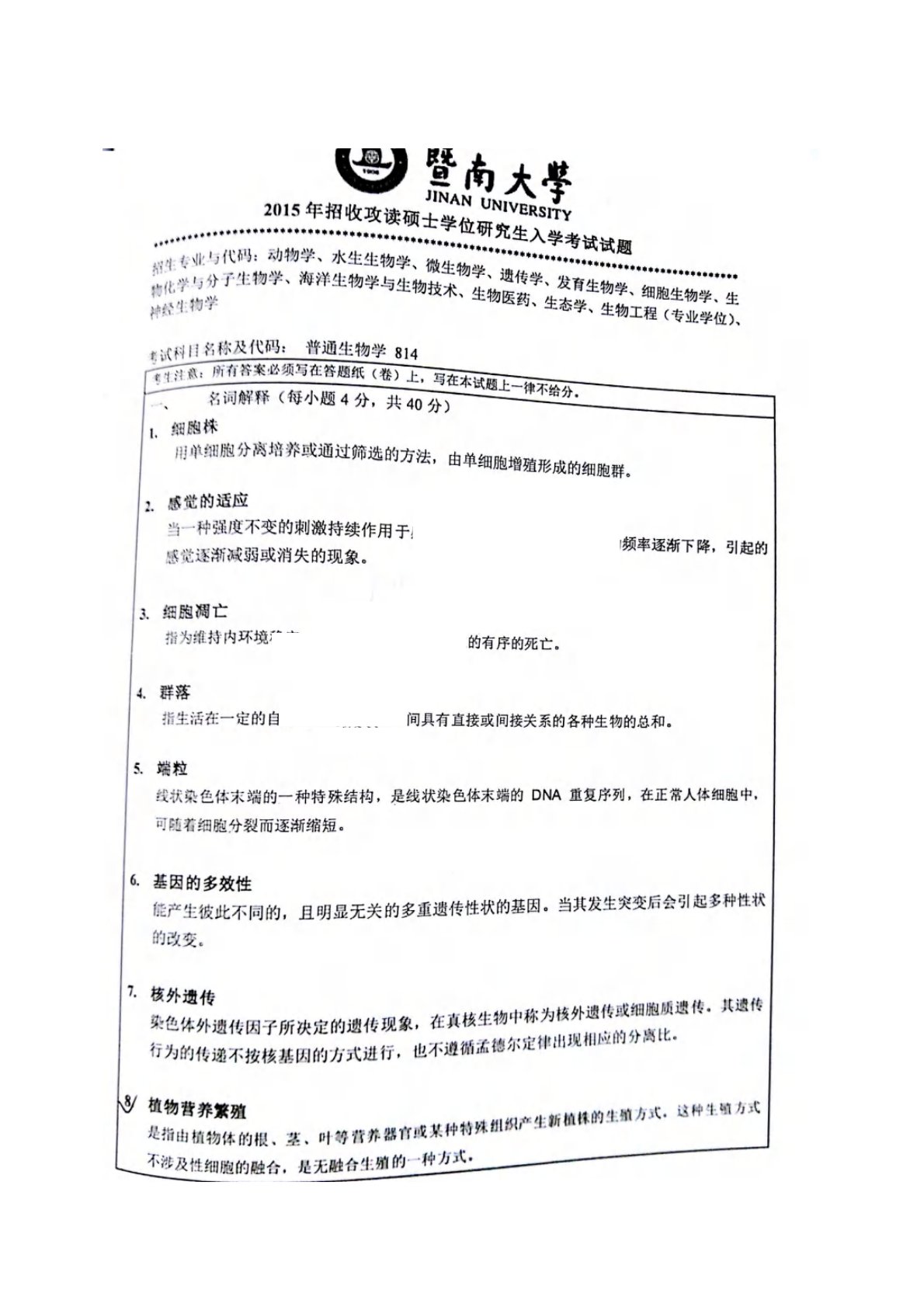 暨南大学814普通生物学2015年真题答案