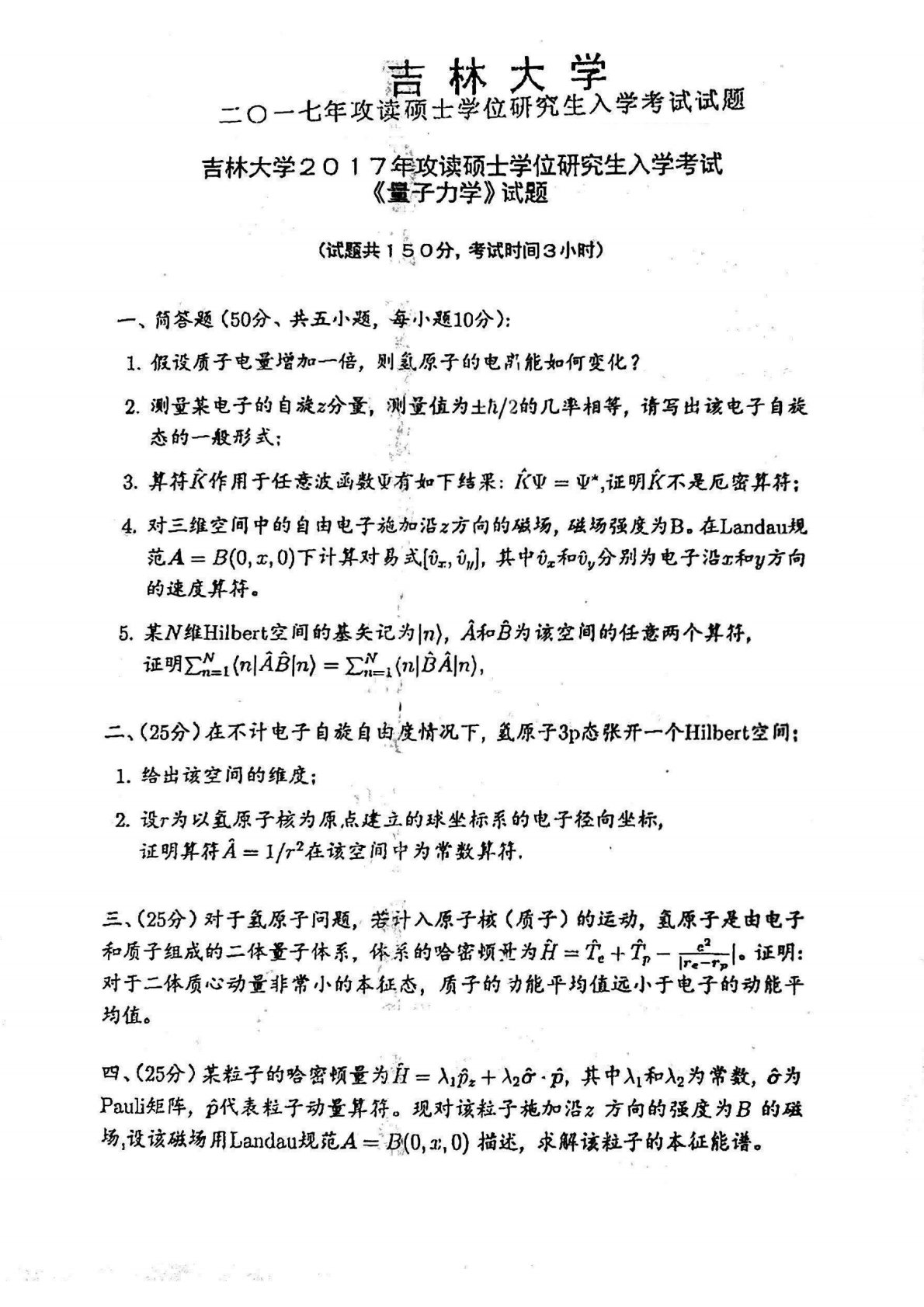吉林大学854量子力学2017年考研真题