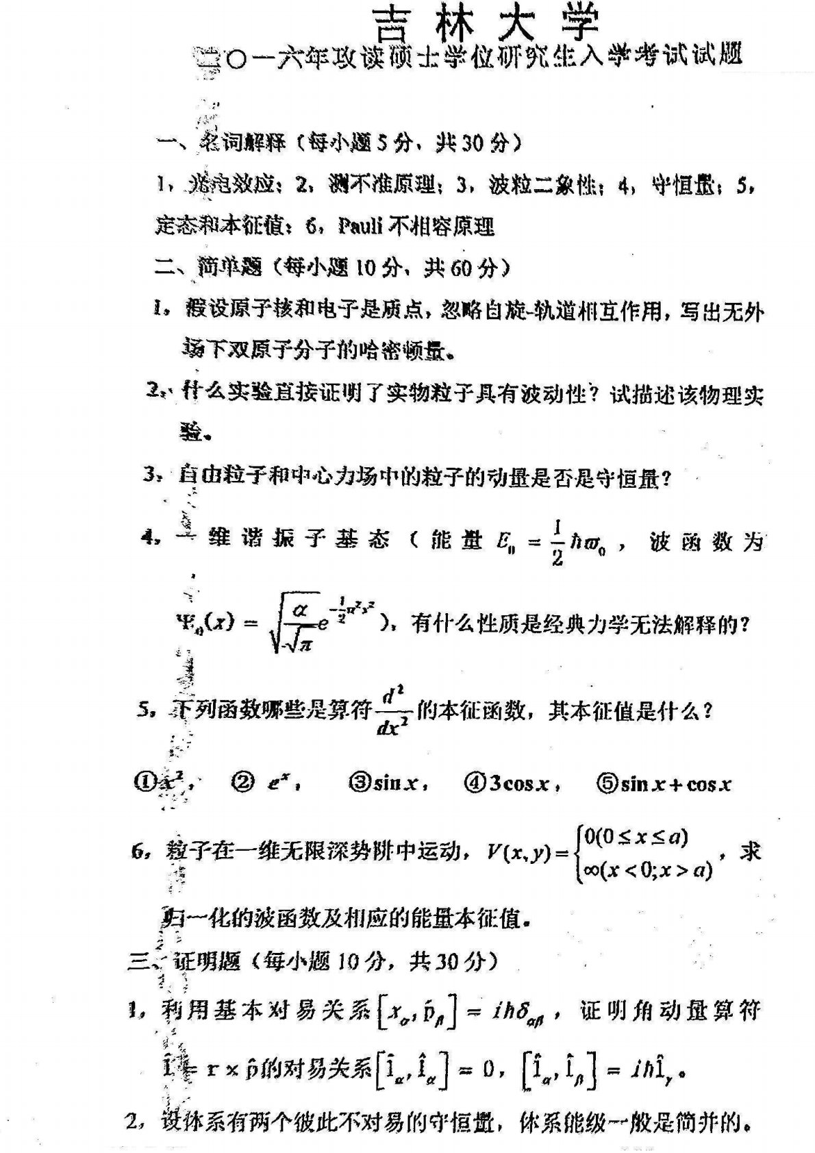 吉林大学854量子力学2016年考研真题