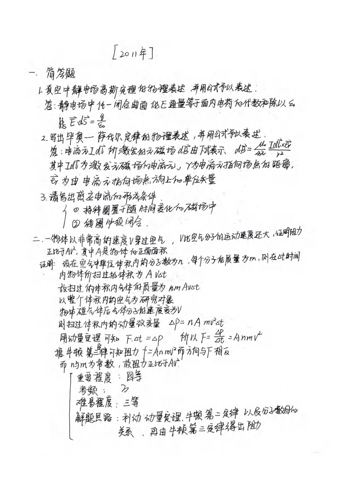 吉林大学647普通物理(力学、热学、电磁学)2011年真题及答案解析