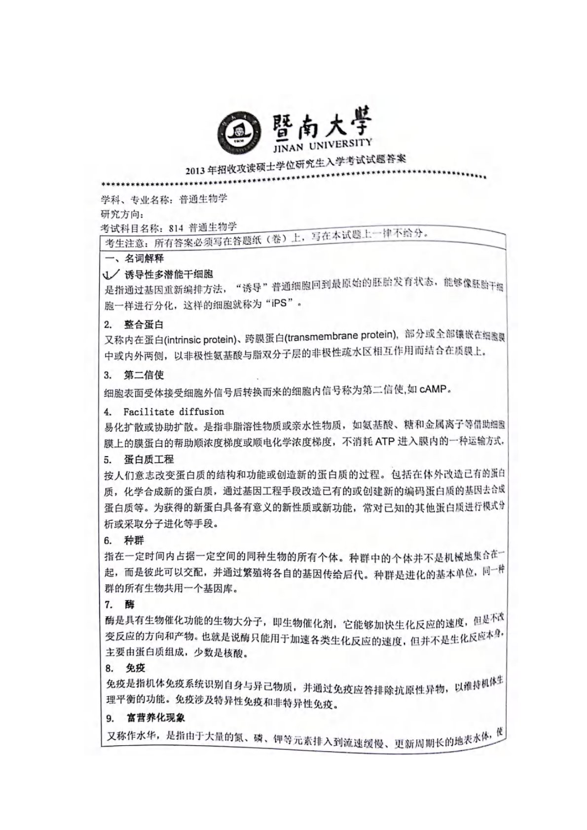 暨南大学814普通生物学2013年真题答案