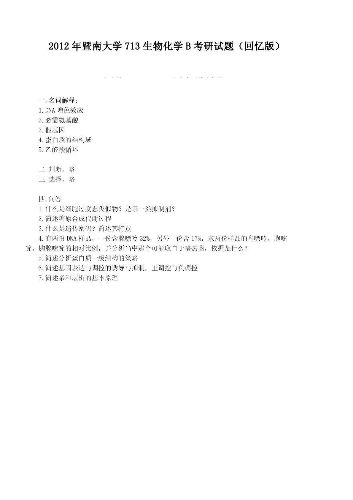 暨南大学712生物化学A2012年真题(回忆版)