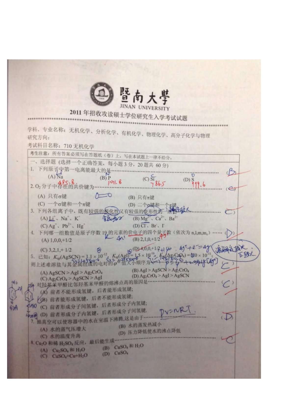 暨南大学710无机化学2011年真题答案