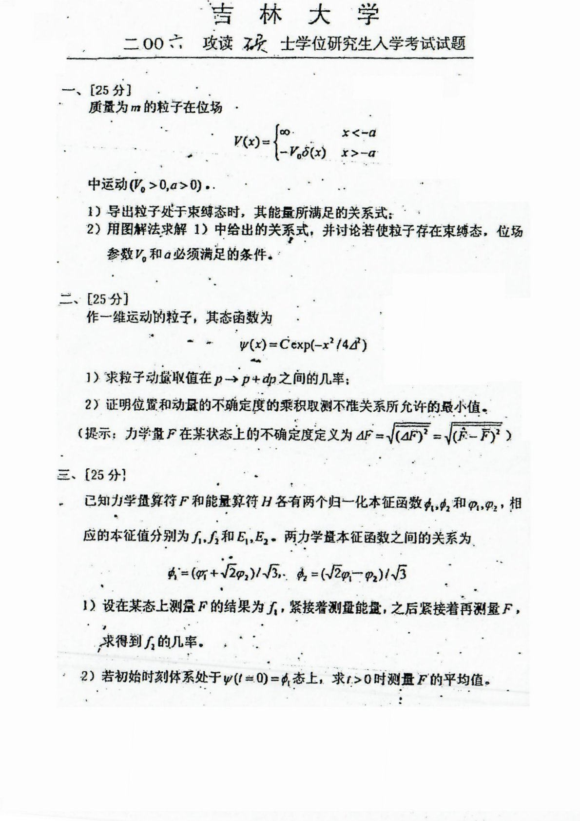 吉林大学854量子力学2006年考研真题