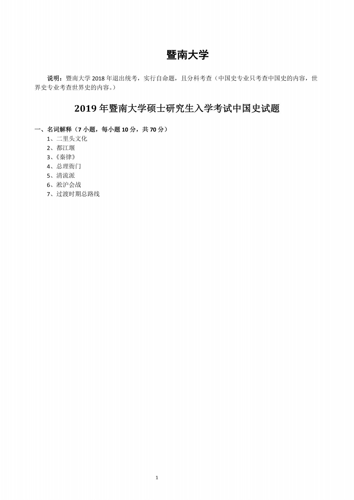 暨南大学728中国史基础2019年考研真题