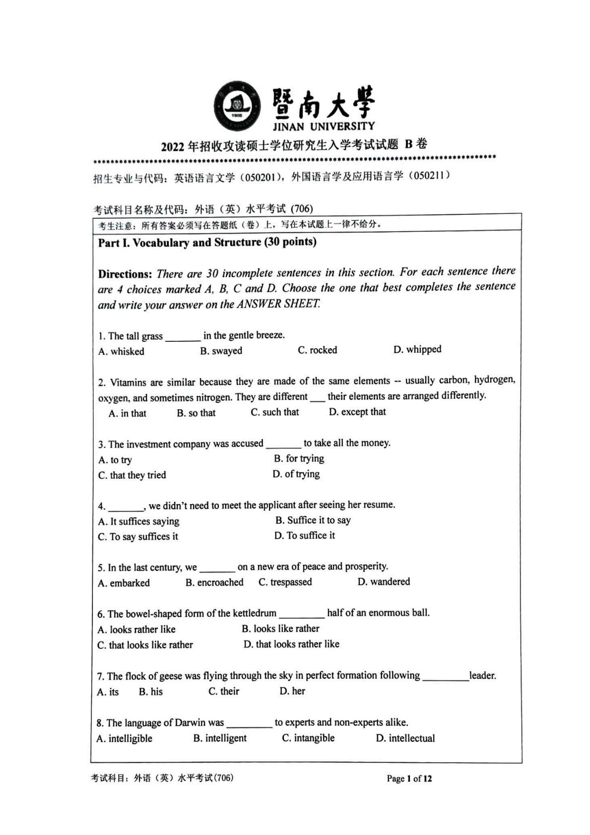 暨南大学706 外语(英)水平考试2022年真题