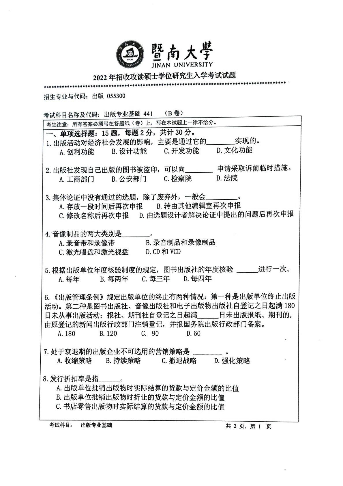 暨南大学441出版专业基础2022年真题