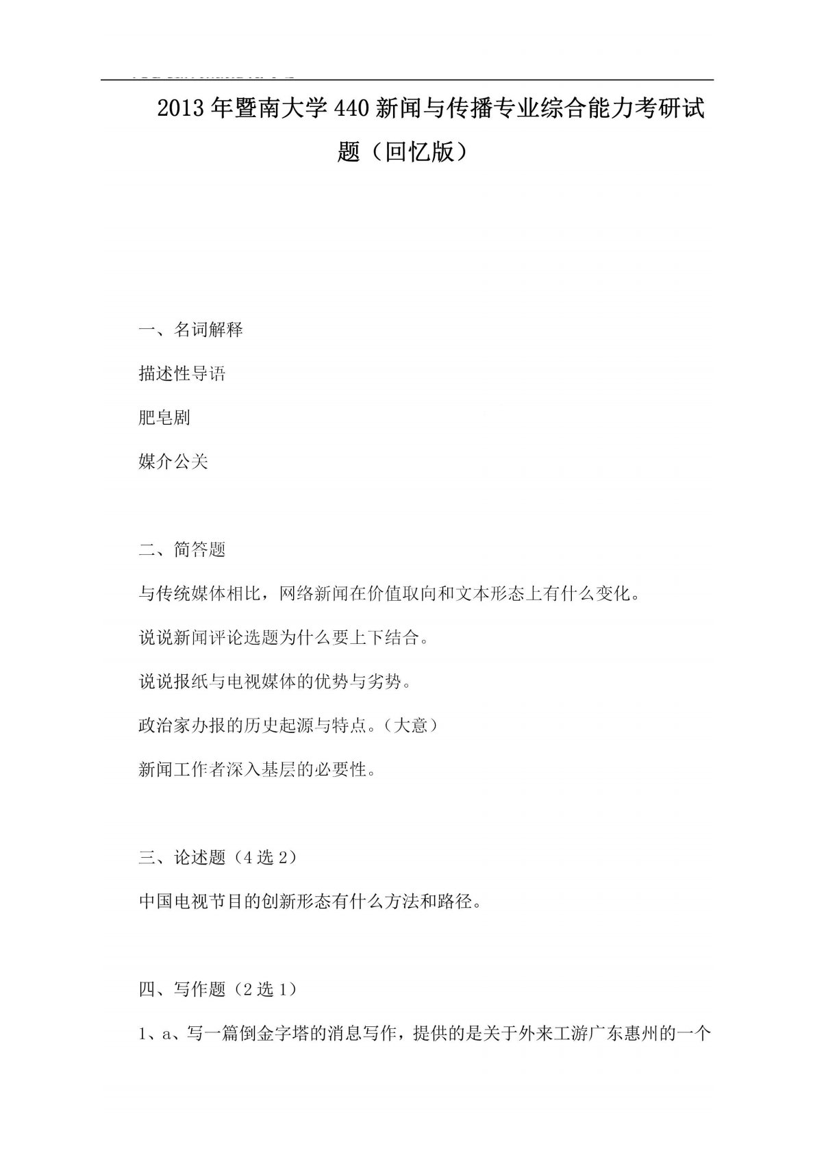 暨南大学440新闻与传播专业基础2013年真题回忆版