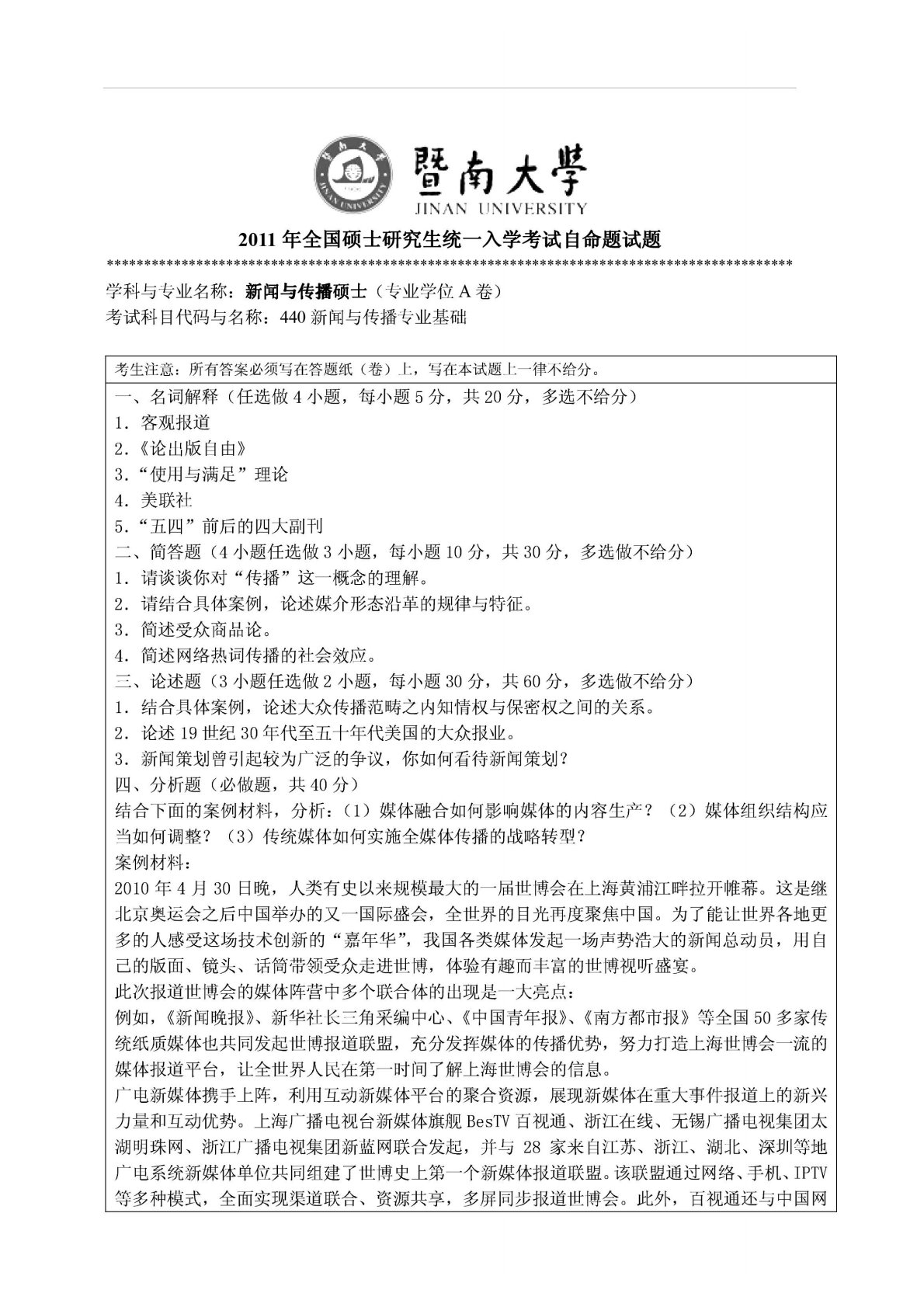 暨南大学440新闻与传播专业基础2011年真题