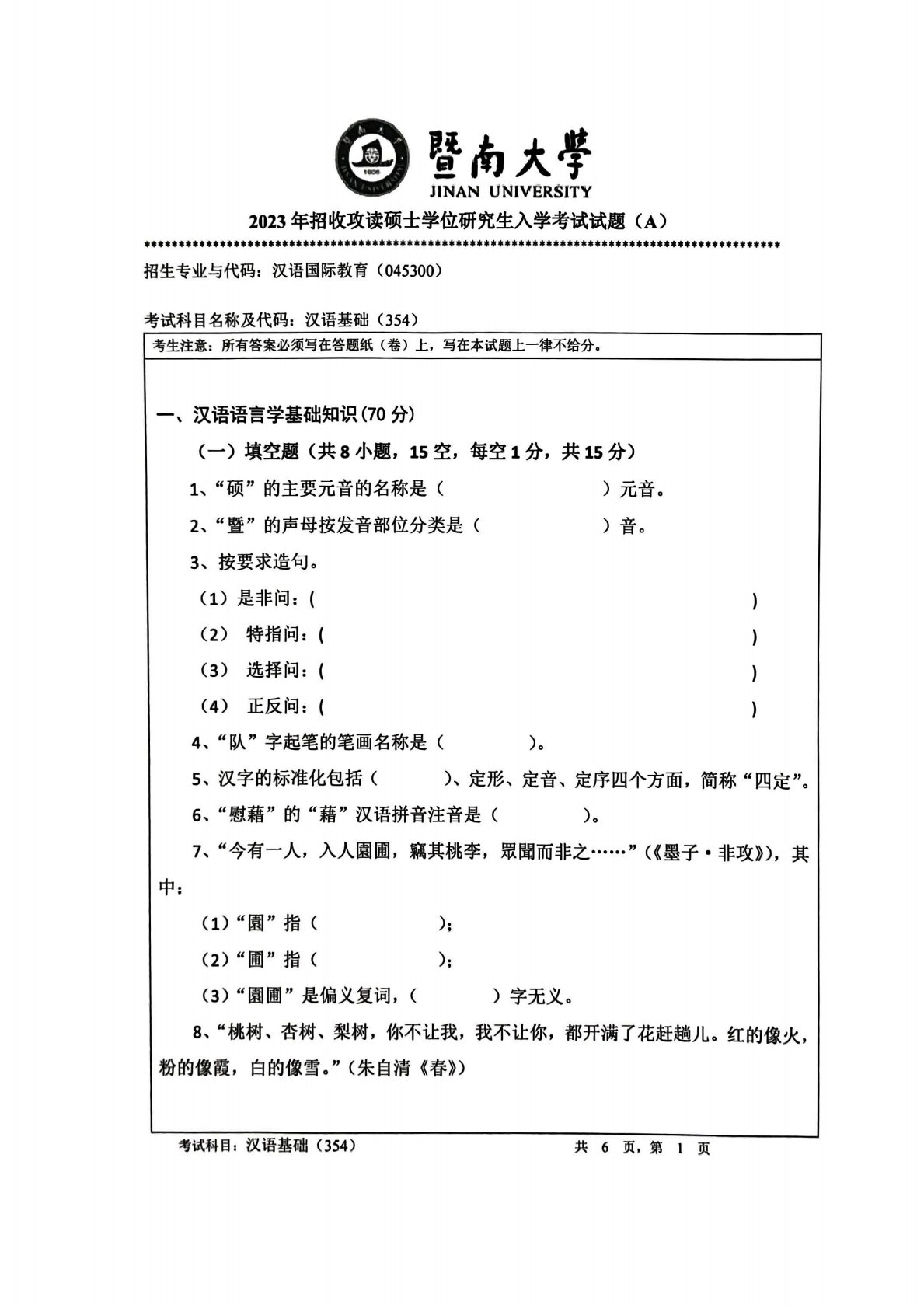 暨南大学354汉语基础2023年真题A