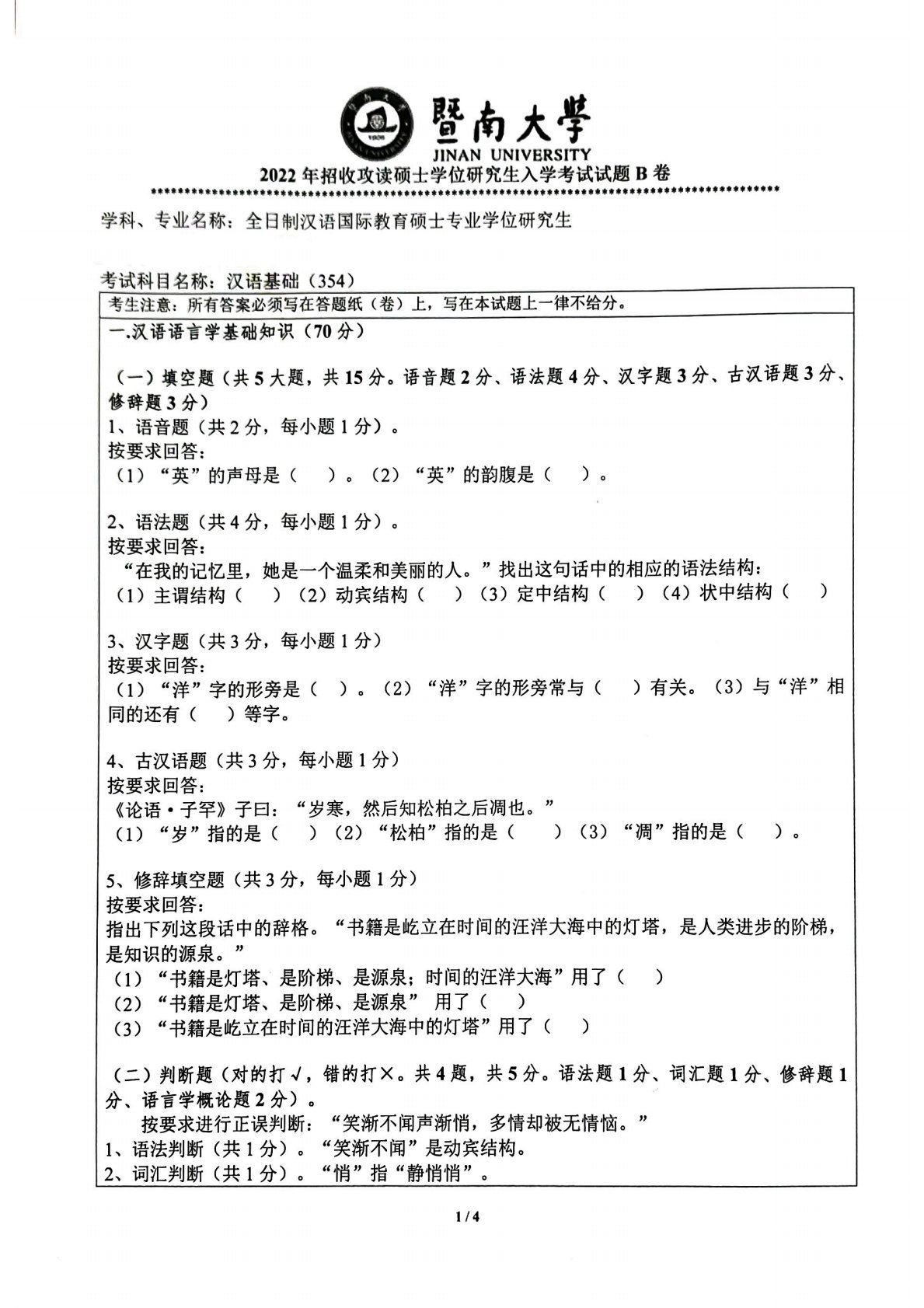 暨南大学354汉语基础2022年真题