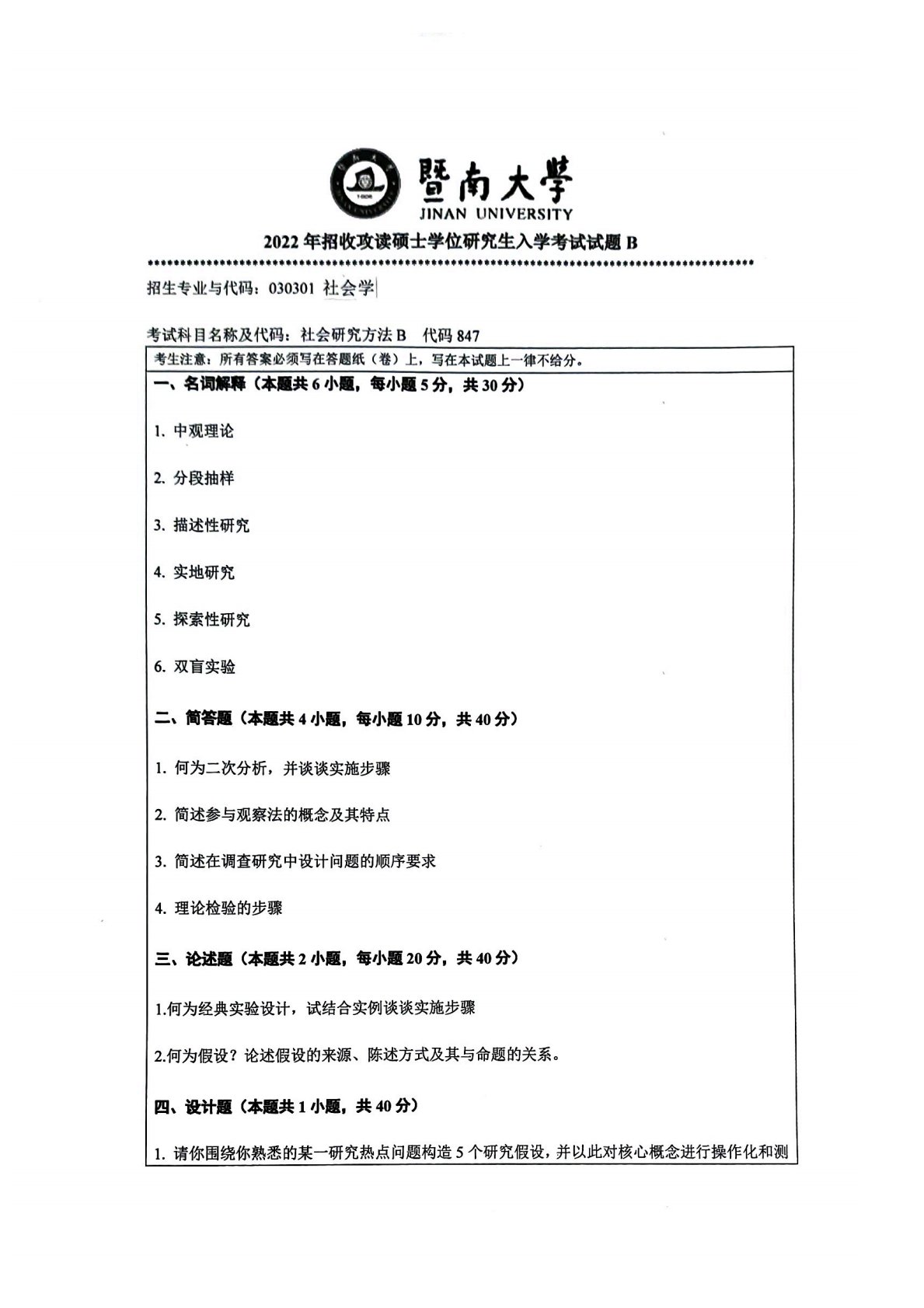 暨南大学847社会研究方法B2022年真题