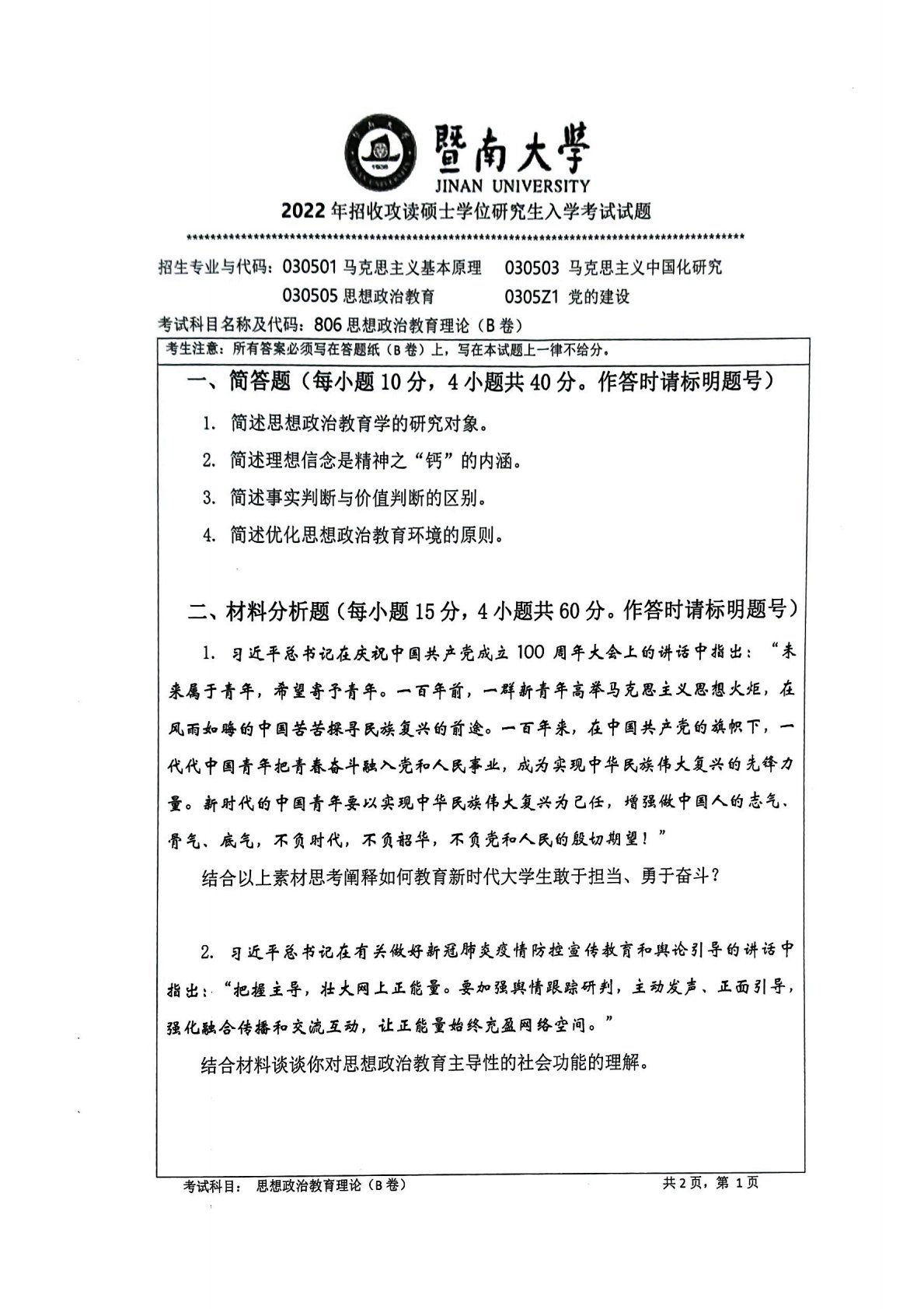 暨南大学806思想政治教育理论与实践2022年真题