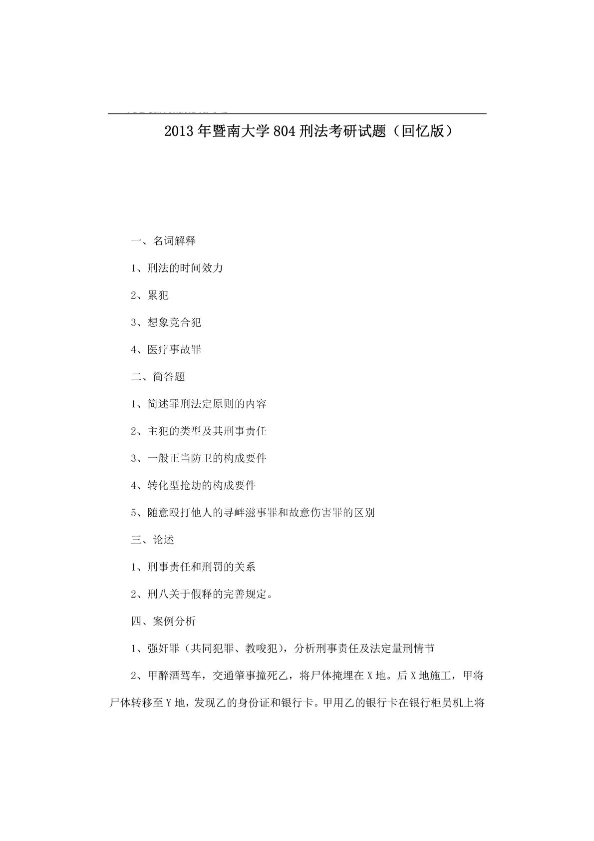 暨南大学804刑法学2013年真题回忆版