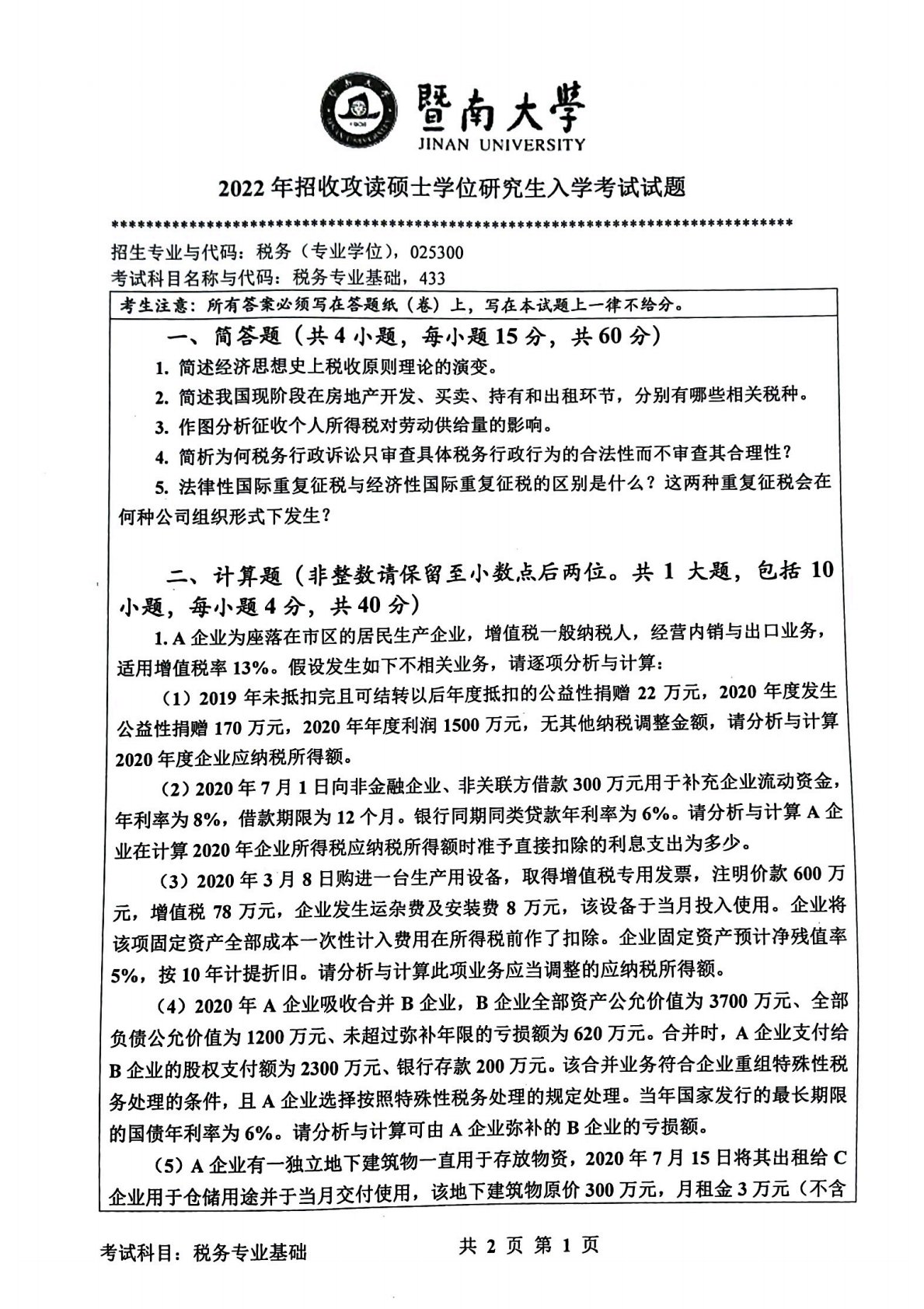 暨南大学433税务专业基础2022年真题