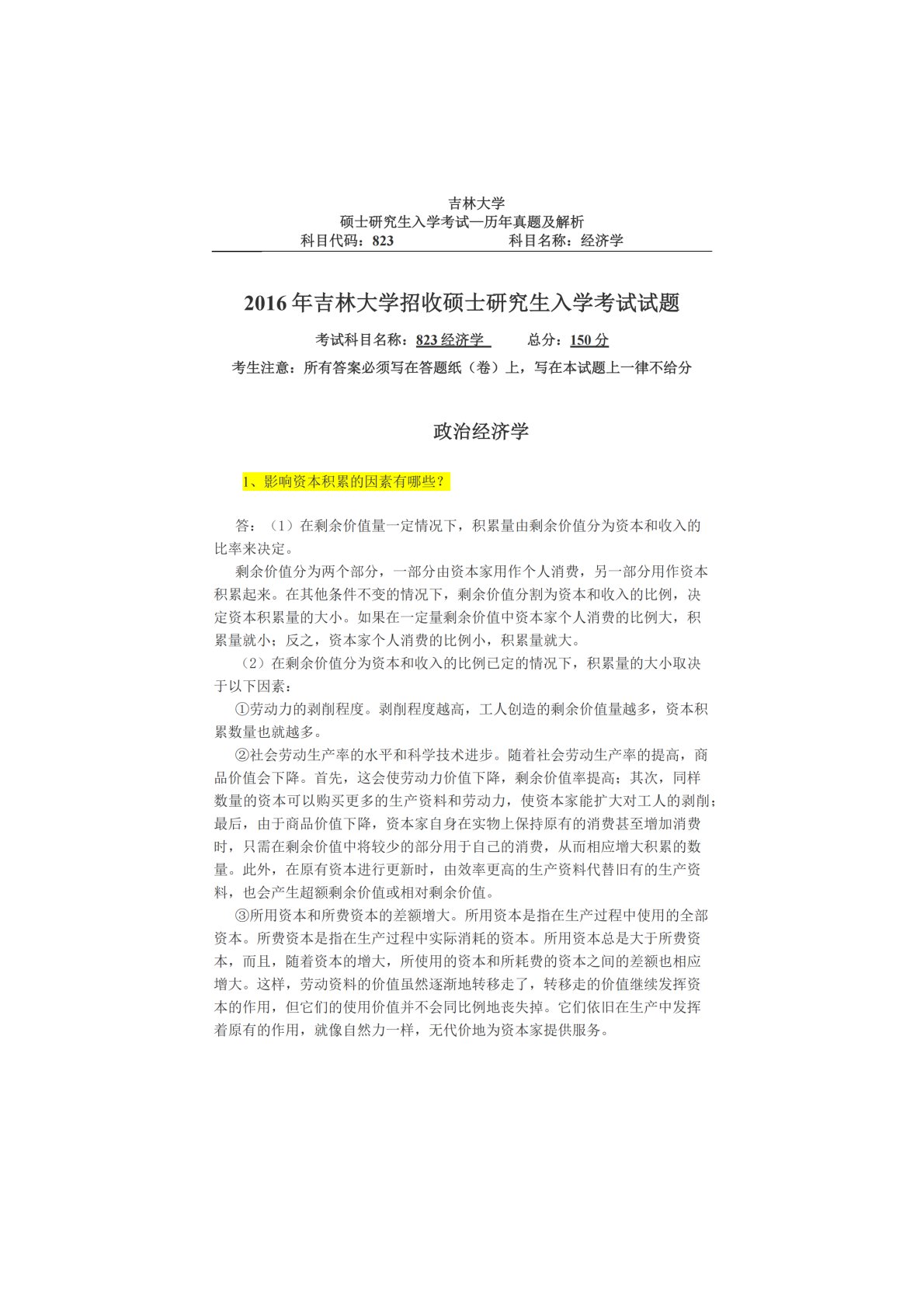 吉林大学823经济学(政治经济学、西方经济学)2016年真题及答案