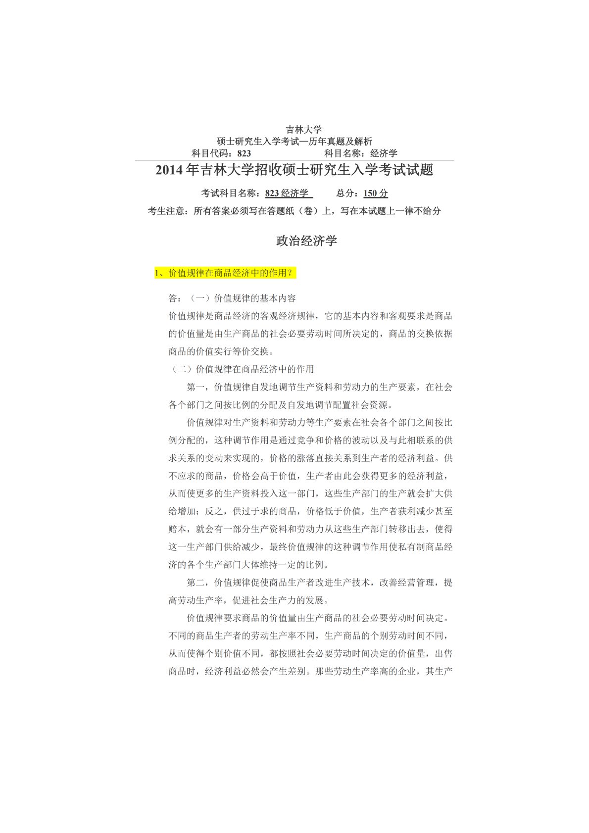 吉林大学823经济学(政治经济学、西方经济学)2014年真题及答案