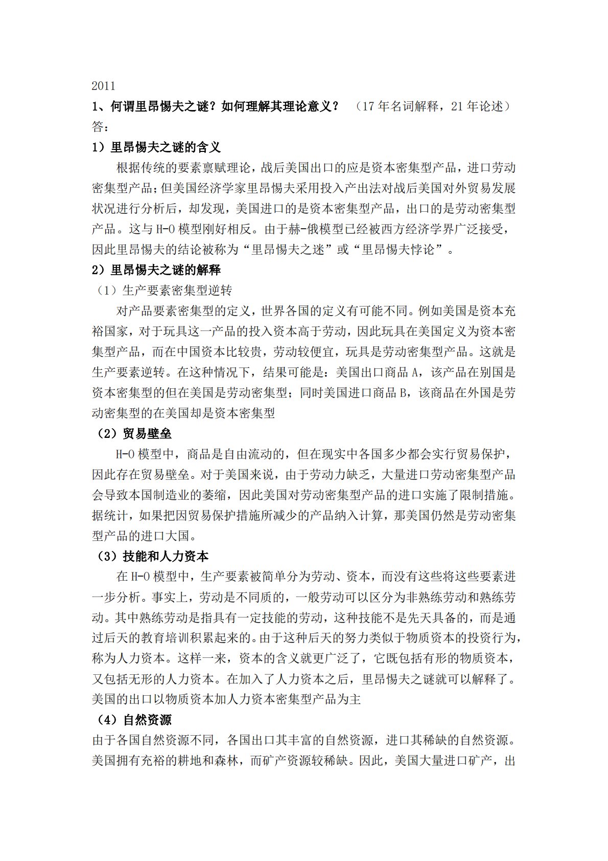 20111、何谓里昂惕夫之谜?如何理解其理论意义?(17年名词解释,21年论述)答:1)里昂惕夫之谜的含义根据传统的要素禀赋理论,战后美国出口的应是资本密集型产品,进口劳动密集型产品;但美国经济学家里昂惕夫采用投入产出法对战后美国对外贸易发展状况进行分析后,却发现,美国进口的是资本密集型产品,出口的是劳动密集型产品。这与H-O模型刚好相反。由于赫-俄模型已经被西方经济学界广泛接受,因此里昂惕夫的结论被称为“里昂惕夫之迷”或“里昂惕夫悖论”。2)里昂惕夫之谜的解释(1)生产要素密集型逆转对产品要素密集型的定义,世界各国的定义有可能不同。例如美国是资本充裕国家,对于玩具这一产品的投入资本高于劳动,...