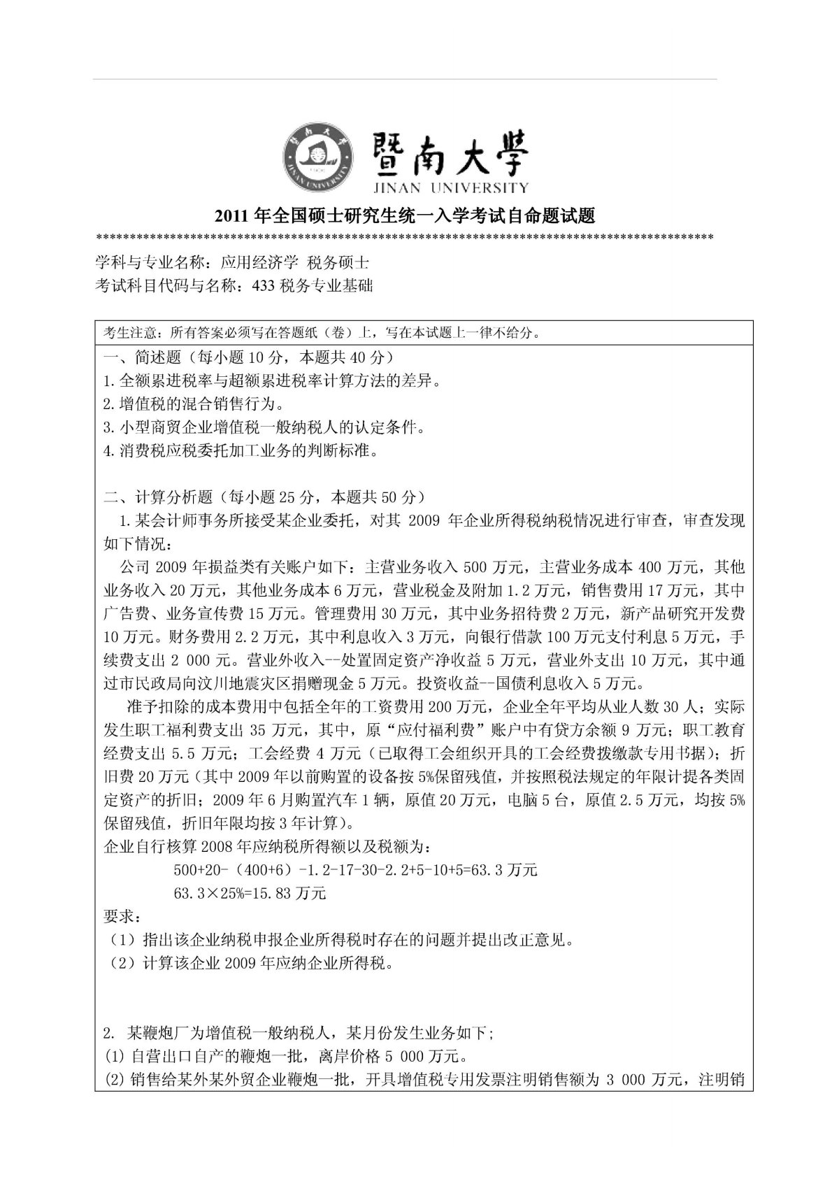暨南大学433税务专业基础2011年真题