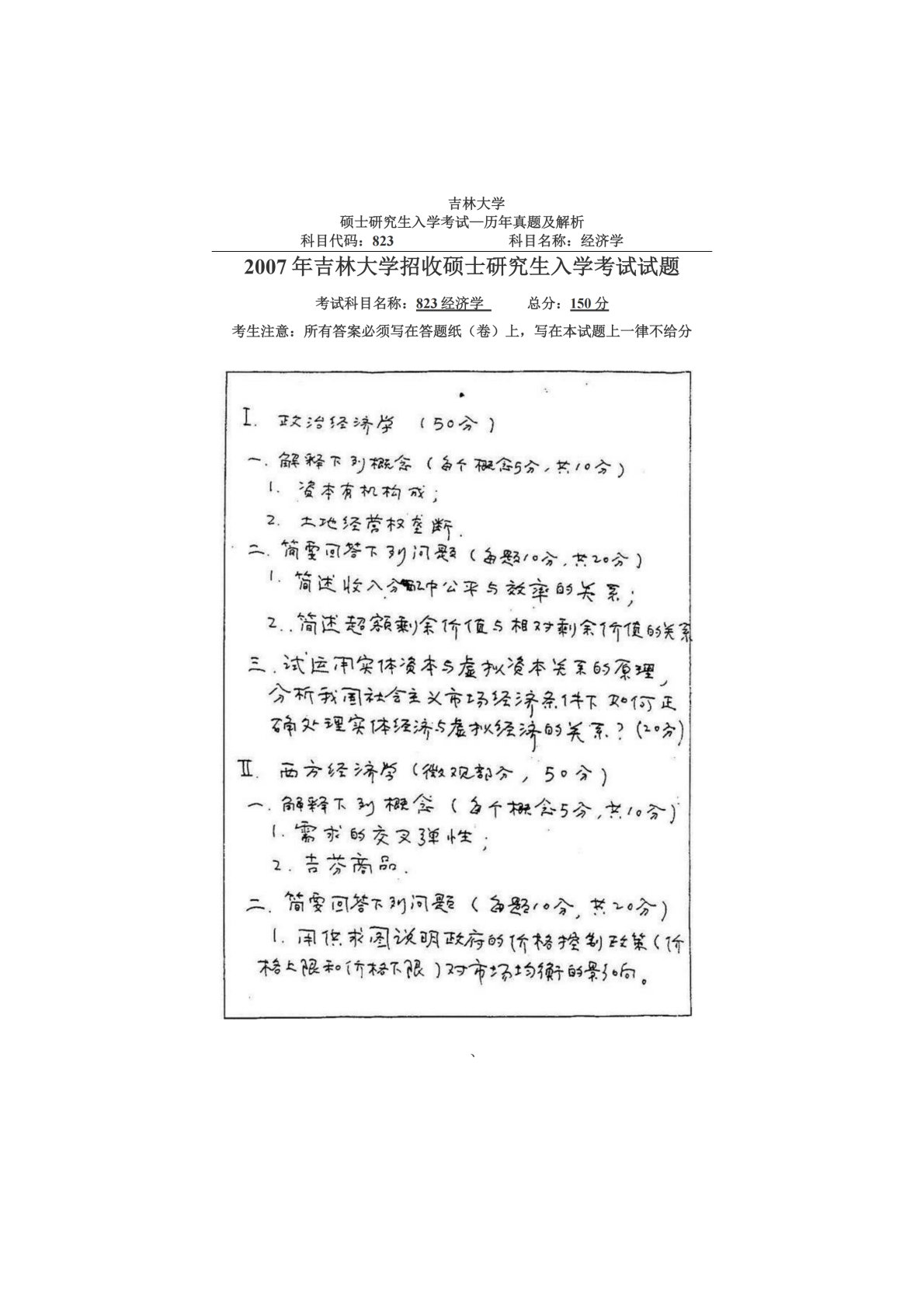 吉林大学823经济学(政治经济学、西方经济学)2007年真题及答案