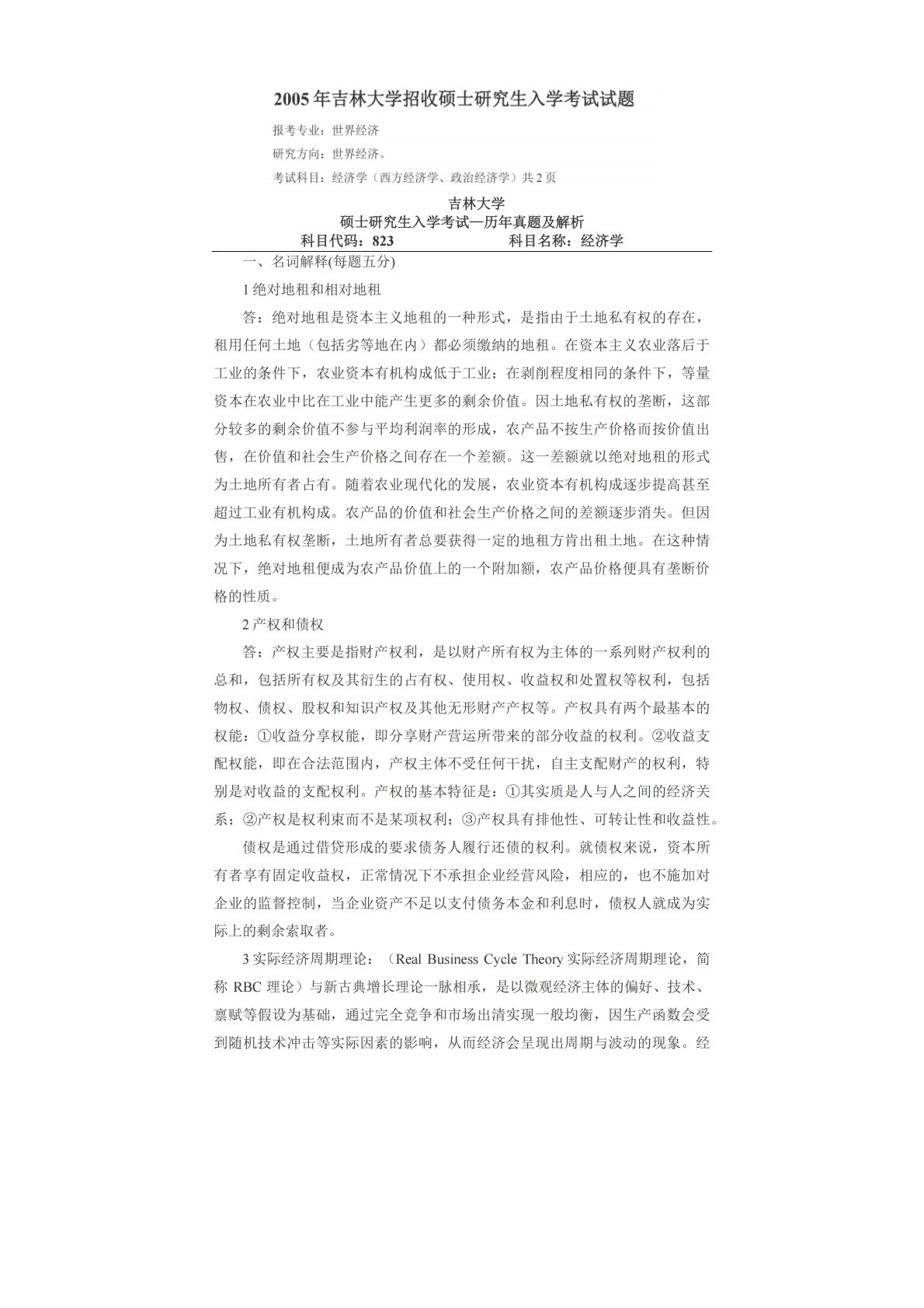 吉林大学823经济学(政治经济学、西方经济学)2005年真题及答案