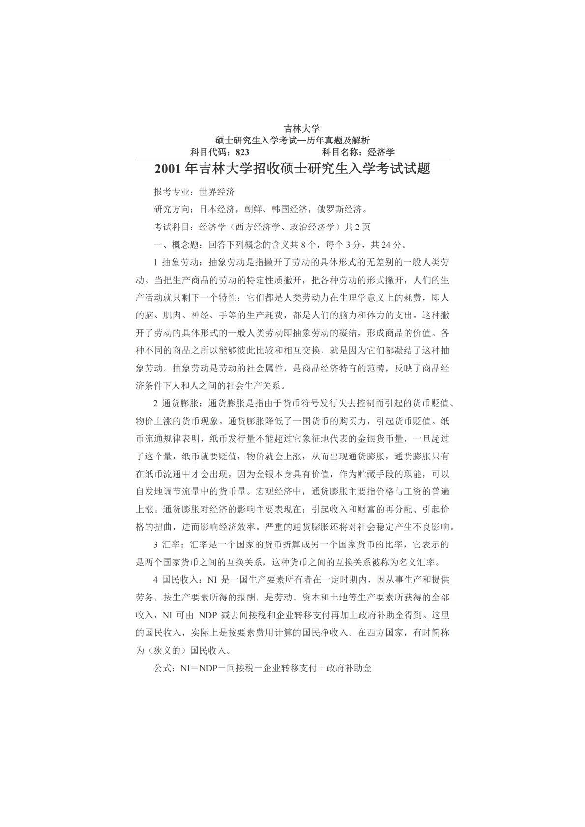 吉林大学823经济学(政治经济学、西方经济学)2001年真题及答案