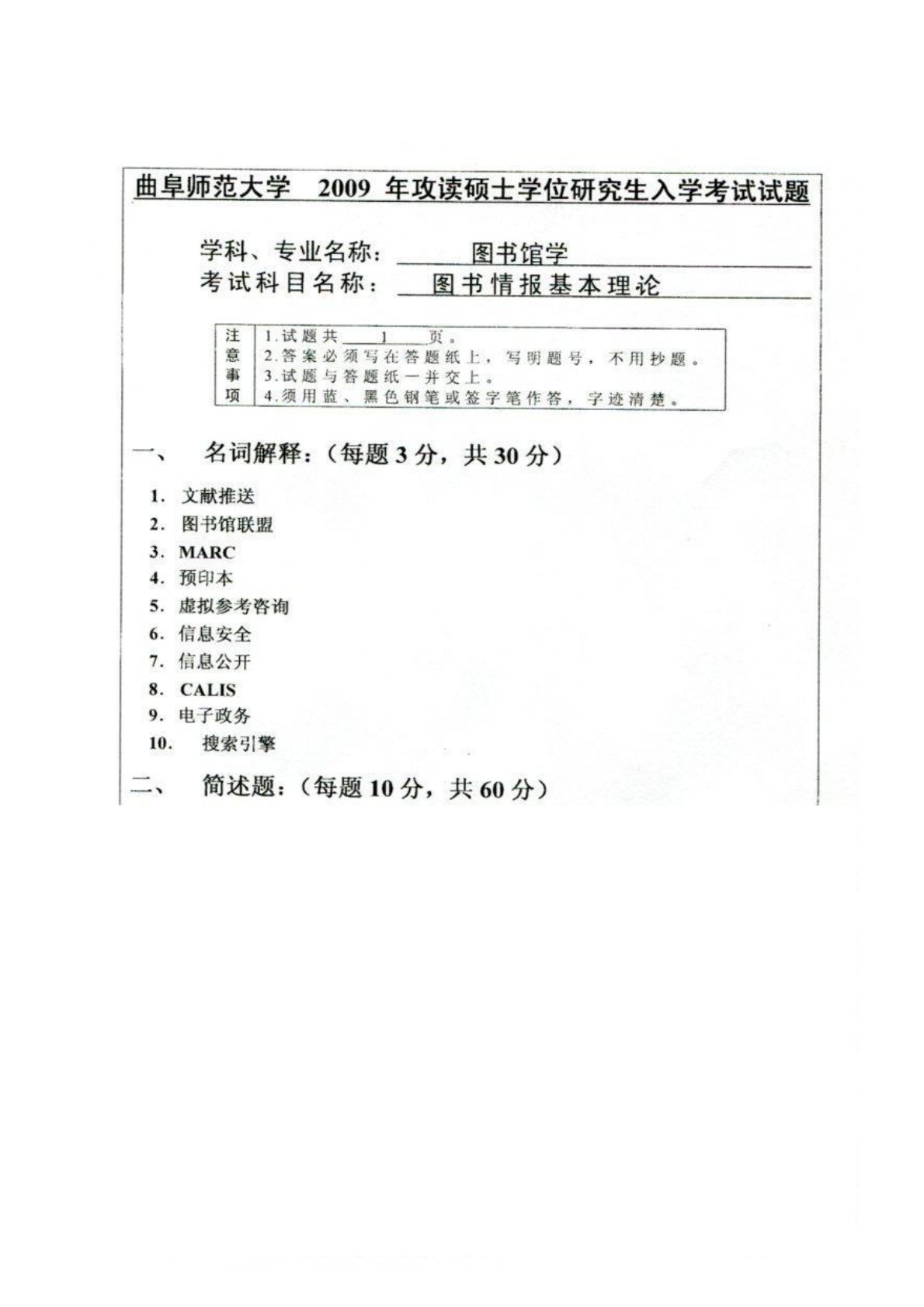 曲阜师范大学756图书情报基本理论(学硕)2009年真题