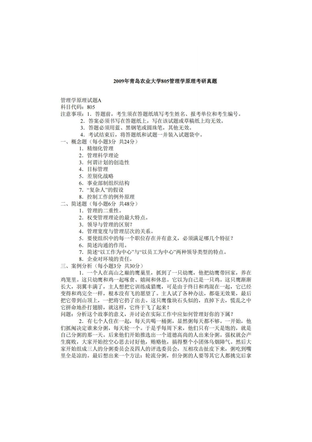 青岛农业大学801管理学原理2009年真题