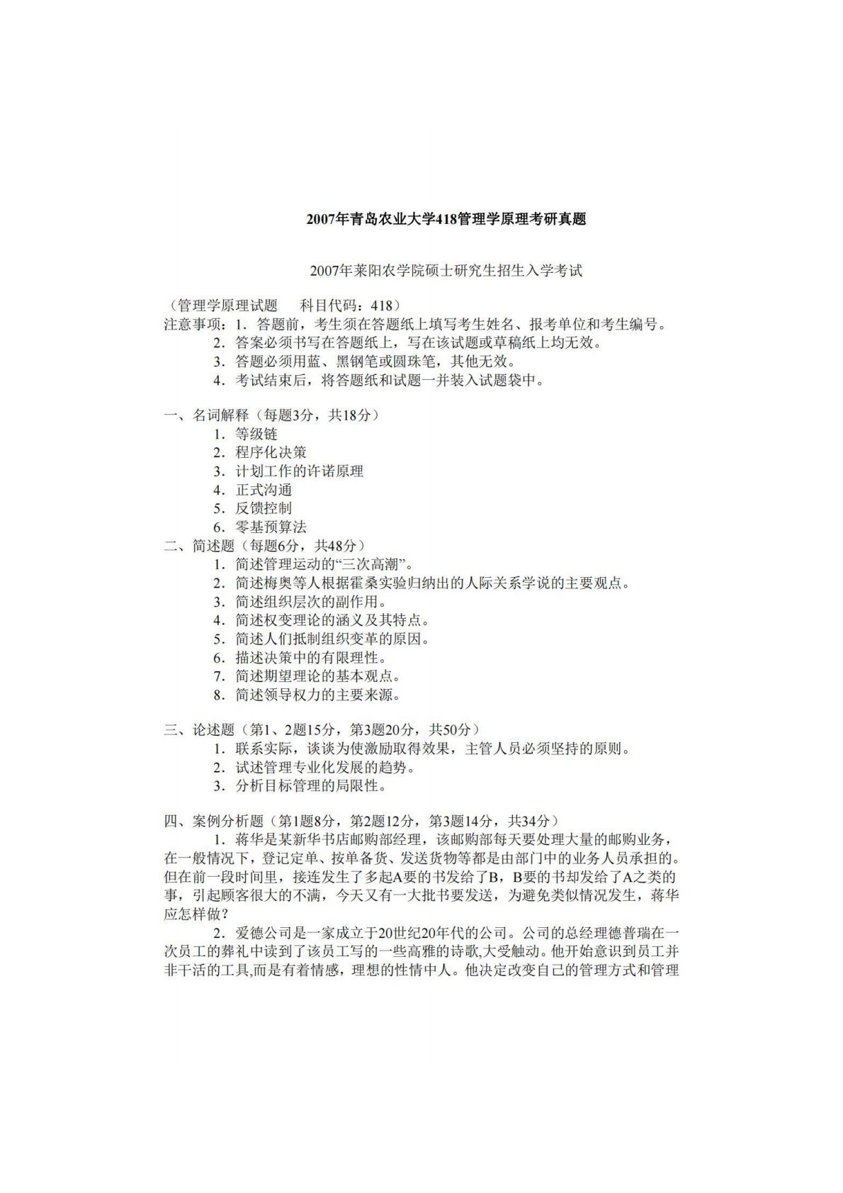 青岛农业大学801管理学原理2007年真题
