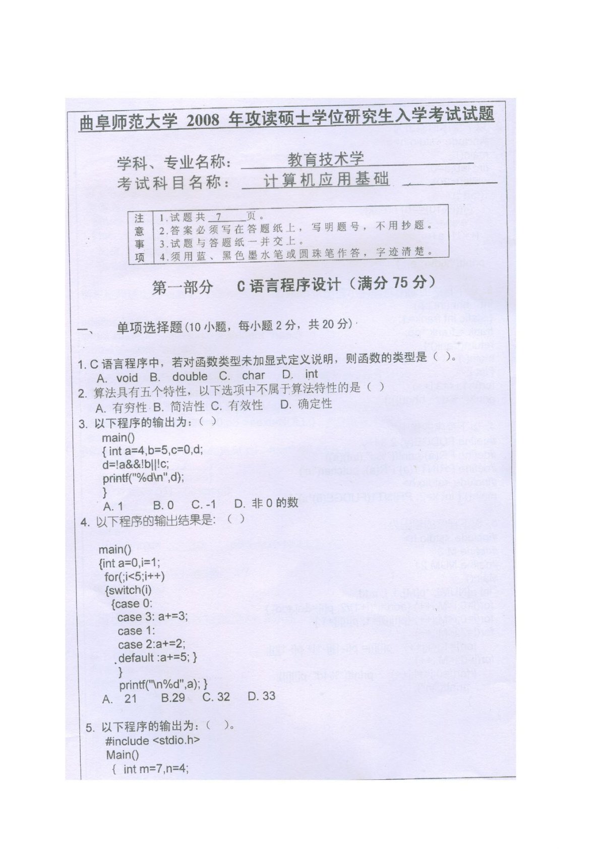 曲阜师范大学855计算机应用基础(学硕)2008年真题