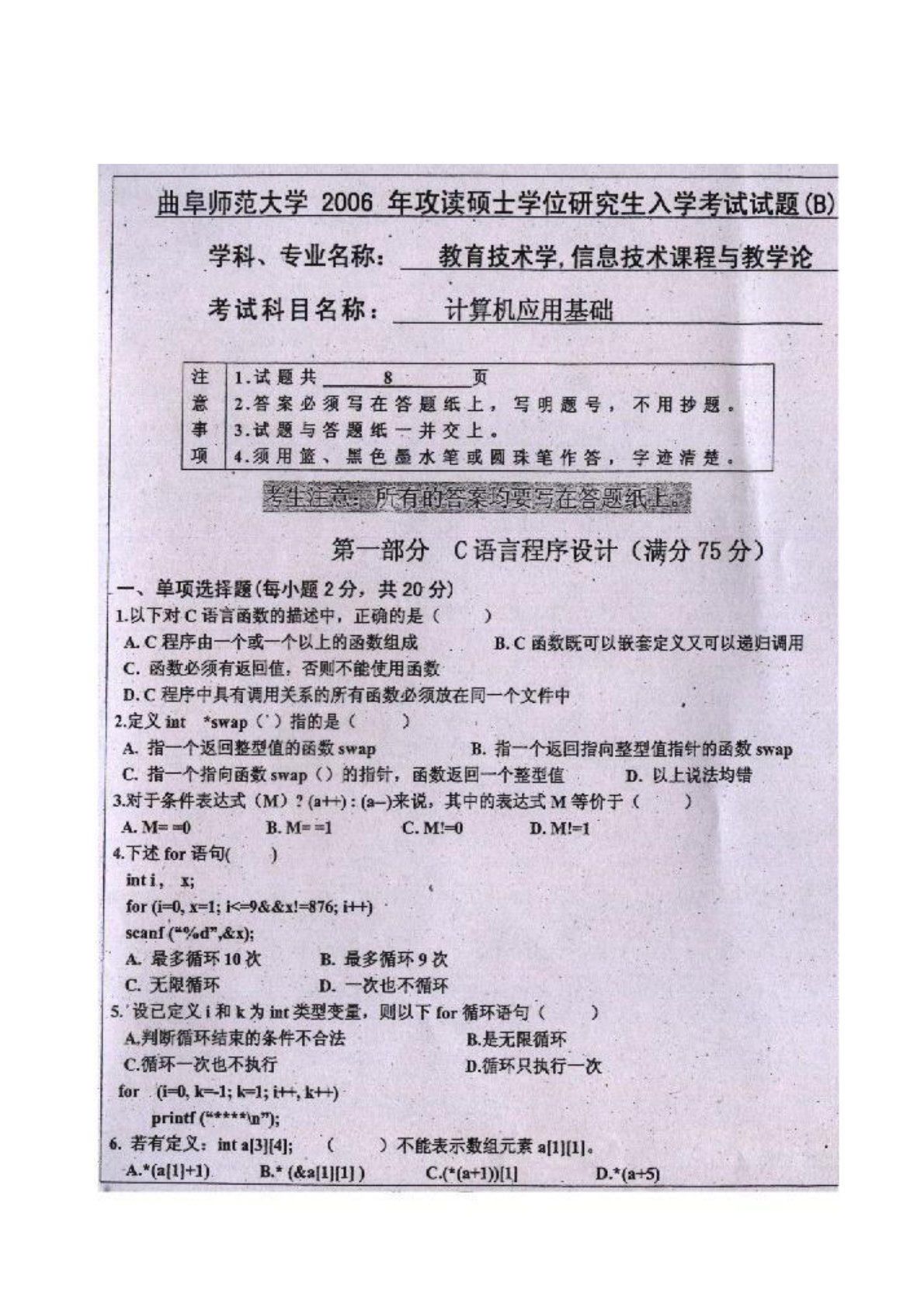 曲阜师范大学855计算机应用基础(学硕)2006年真题