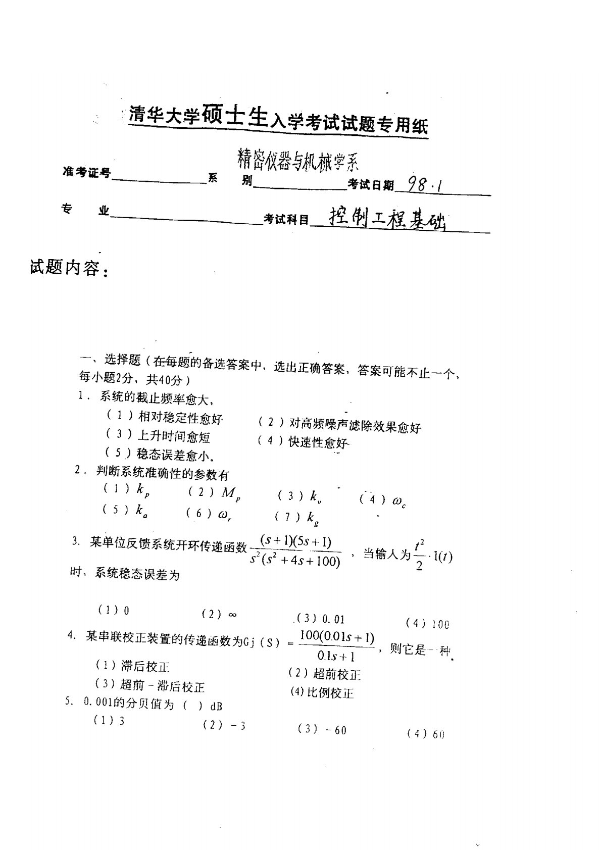 清华大学822控制工程基础1998年真题