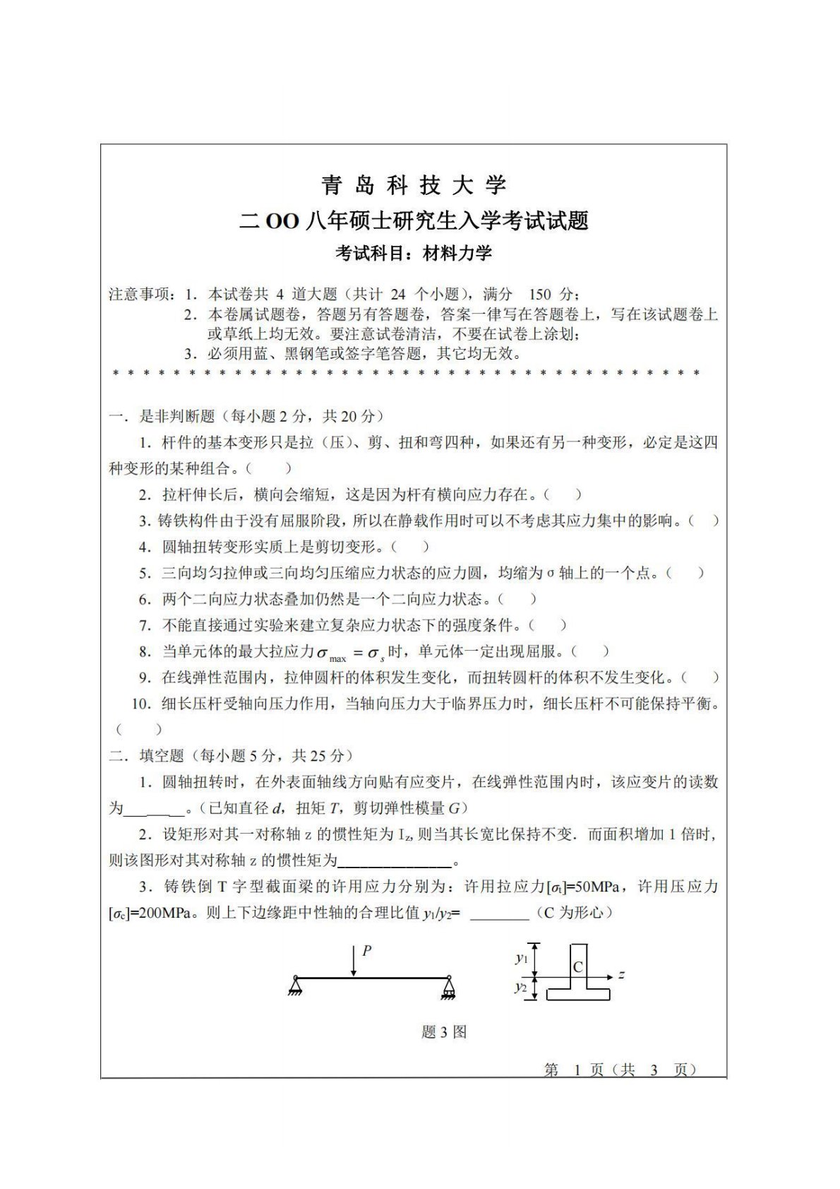 青岛科技大学811材料力学2008年真题