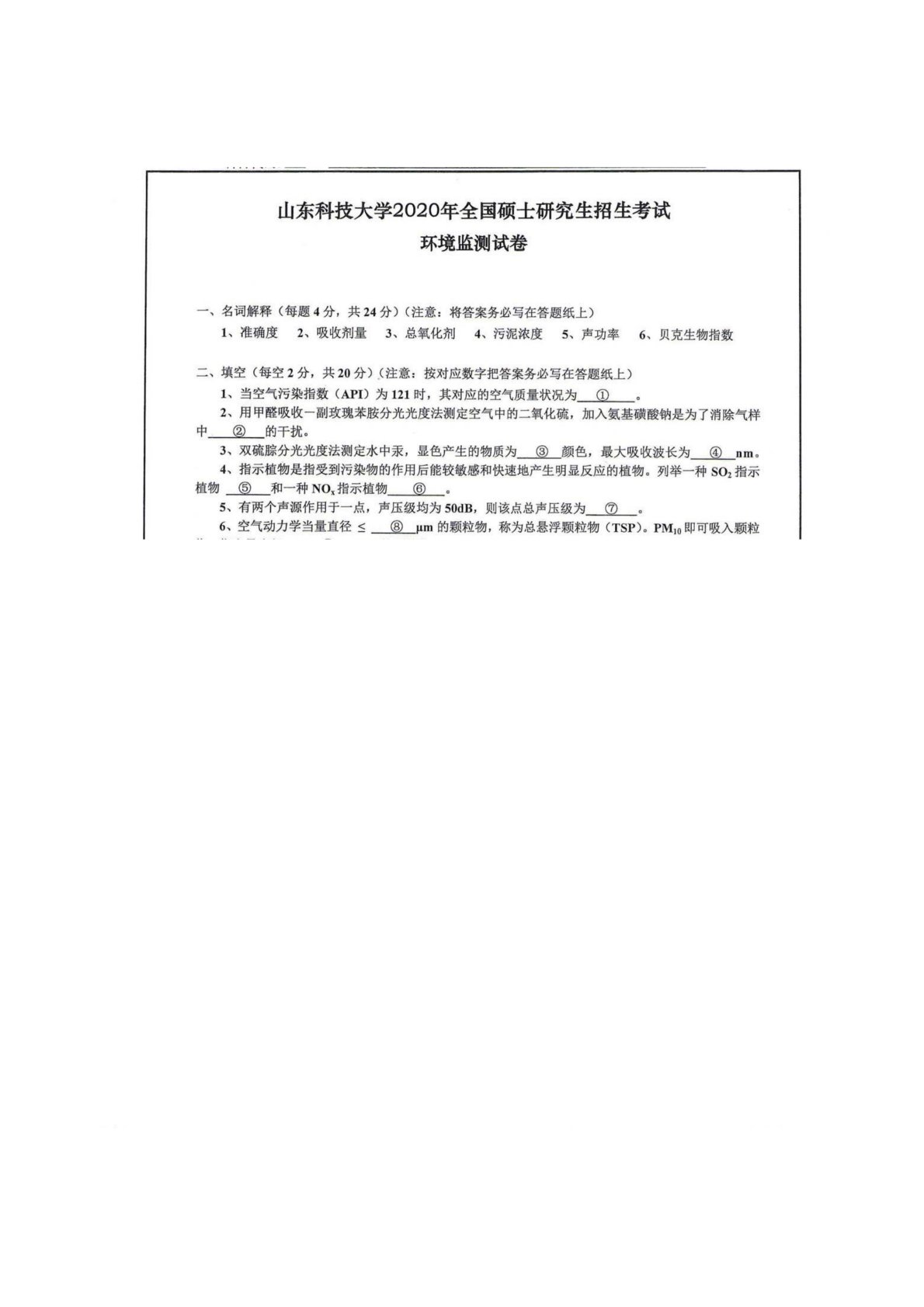 山东科技大学837环境监测2020年真题
